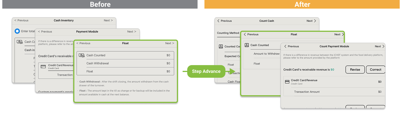 Input fields are redesigned for better clarity—it’s easier to see what needs to be filled out. If there’s a difference between Expected Sales and Counted Amount, the system highlights it: shortfalls appear in red ; overages appear in green. You’ll spot any discrepancies at a glance.