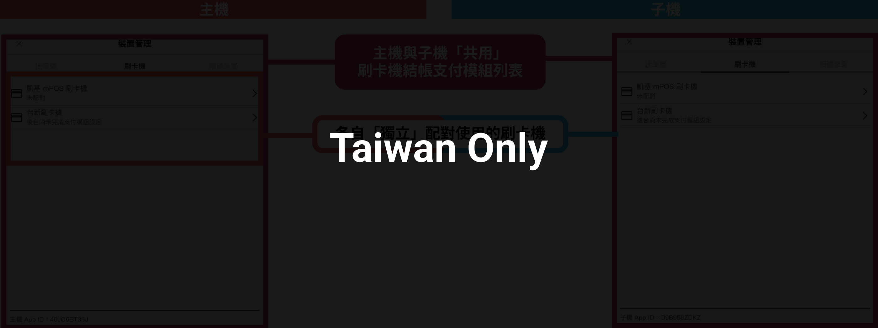 The Card Reader list in Device Management matches the Cashier iPad, but both Ordering iPads and the Cashier iPad can pair with different Card Readers. During checkout, the paired Card Reader will be used to complete the payment. For detailed pairing instructions, see: KGI mPOS, Taishin mPOS.