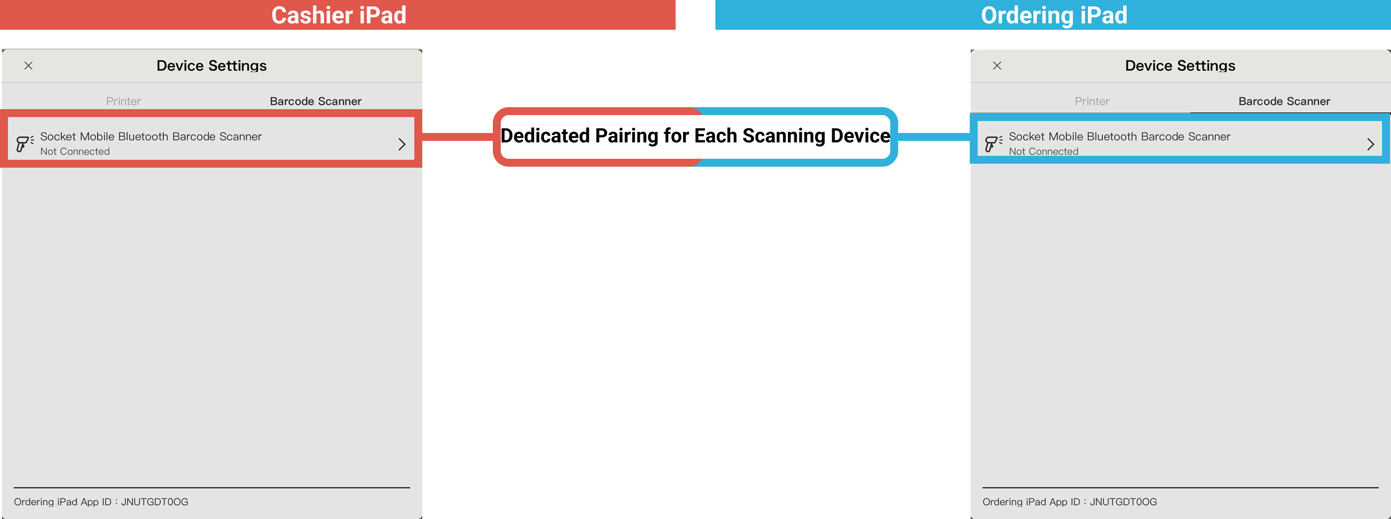 Ordering iPad can also pair with barcode scanners to scan customers’ electronic invoice carrier barcodes and mobile payment codes. For detailed pairing instructions, see: Socket Mobile Wireless Bluetooth 1D Scanner.