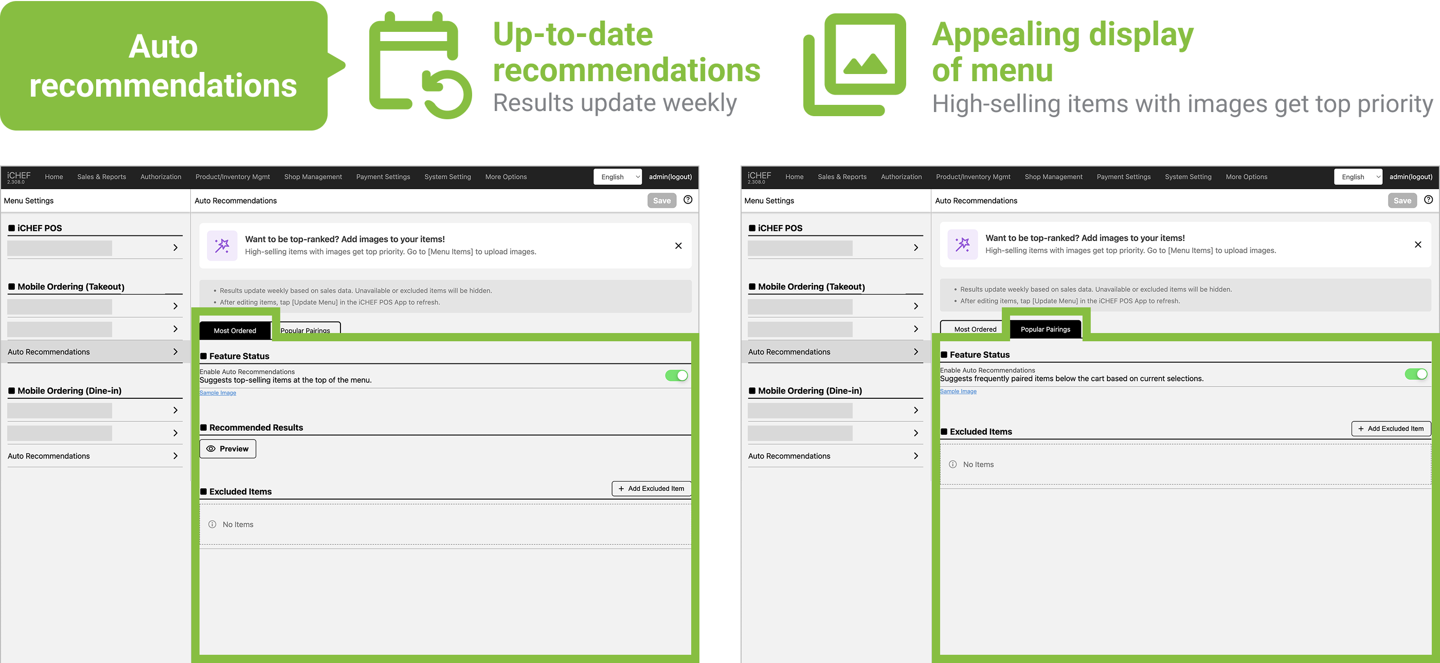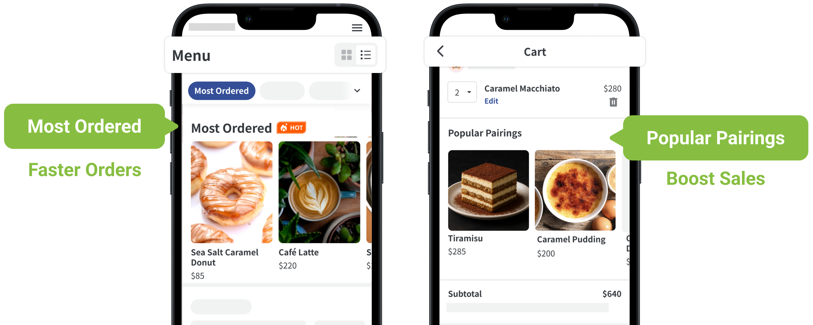 | Mechanism | Automatically recommends the Most Ordered items based on sales data. | Suggests Popular Pairings items below the cart based on current selections. |