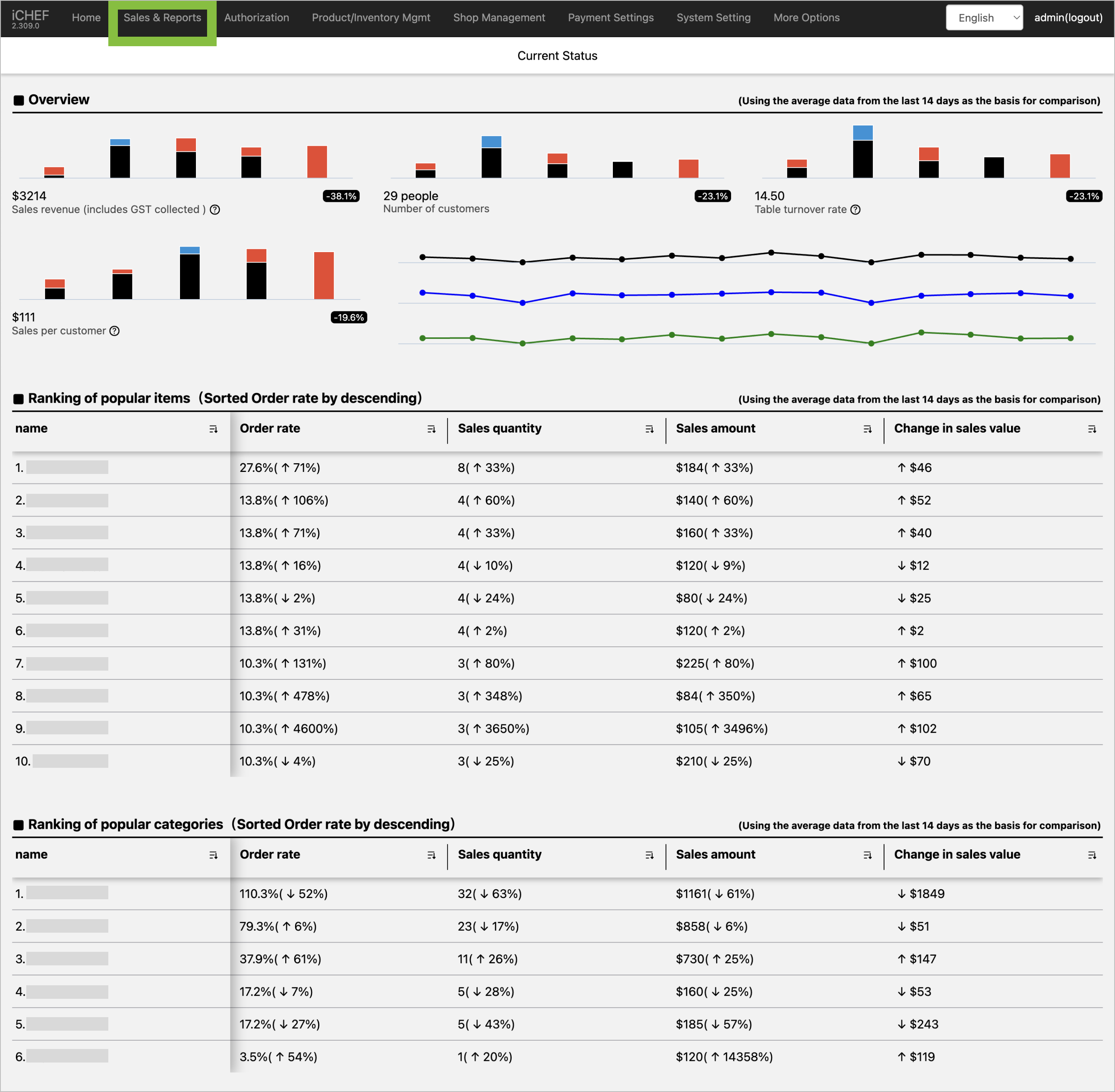 The calculation method for [Ranking of popular categories] is the same as for items, with the main difference being that the data will sum up information for items within the category, to help merchants understand consumer preferences for the restaurant.