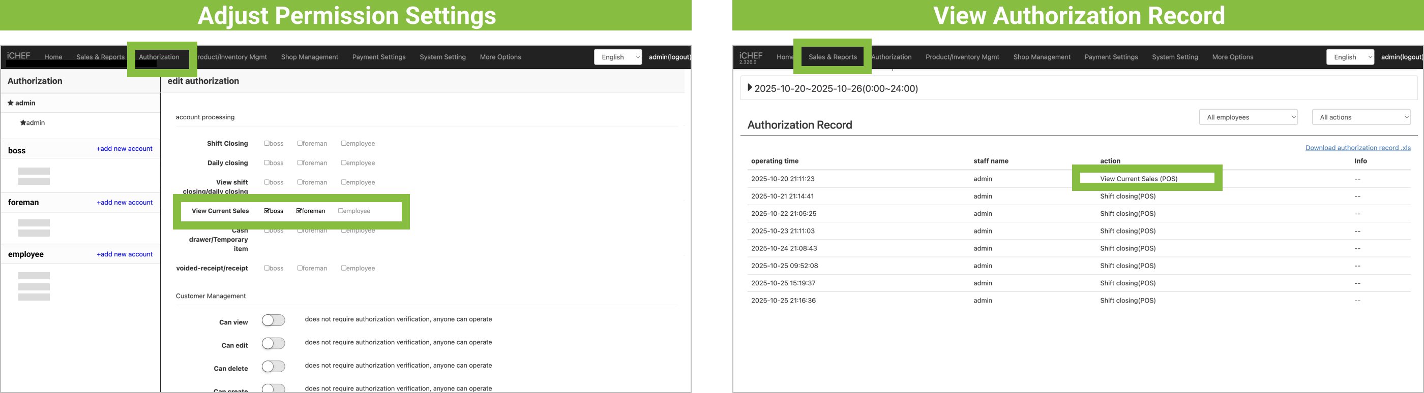- View Authorization Record:Backend > Sales & Reports > Authorization Record