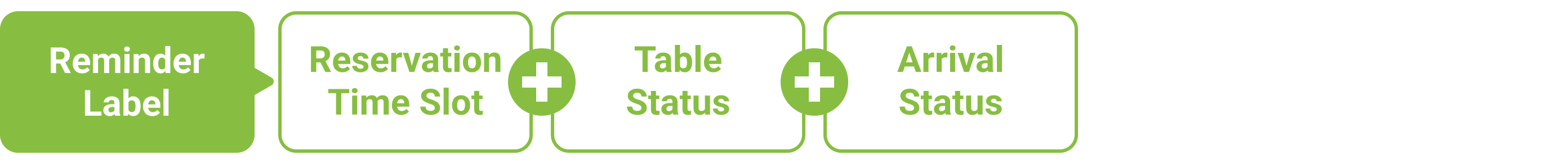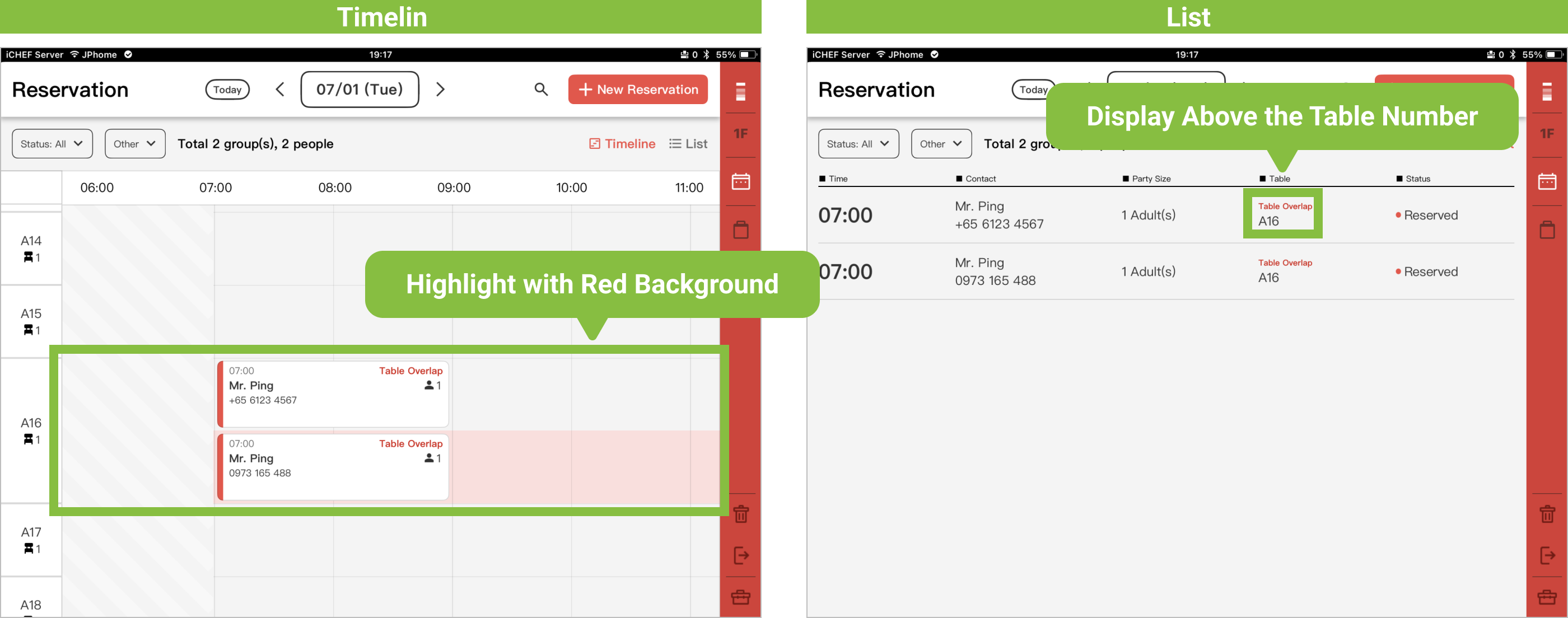 To help in-store staff quickly respond to and assess table and reservation statuses, the iCHEF POS App will provide three types of alert indicators: [Reservation Time Slot], [Table Status], and [Arrival Status].