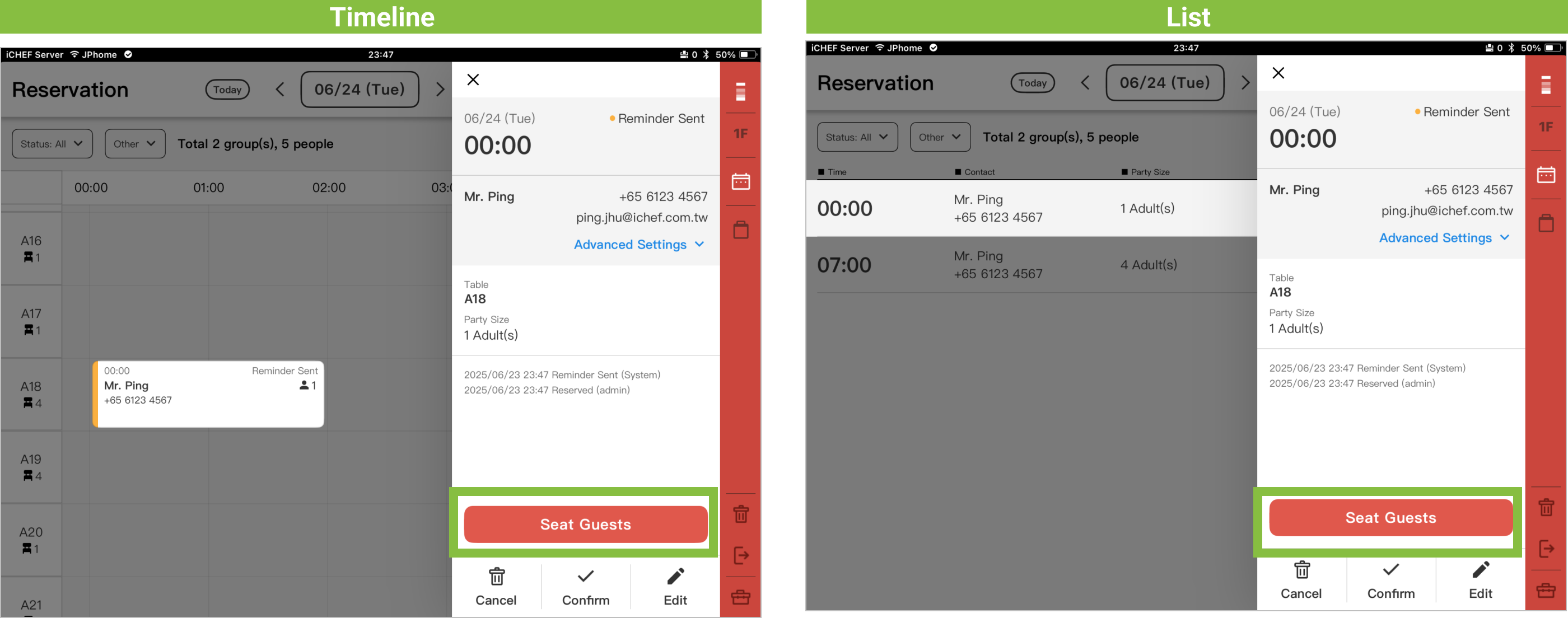 - Step 1: On the reservation page, select a reservation slip, then tap [Seat Guests] to complete! Reservation slip time information will be updated simultaneously: