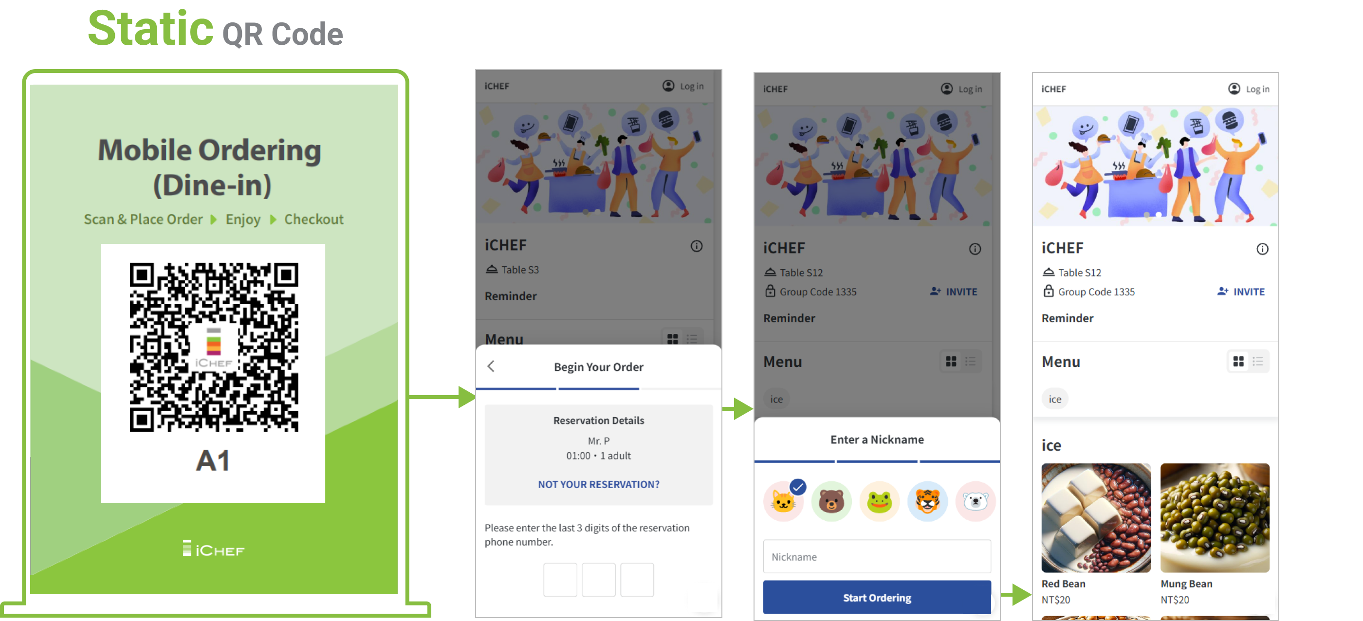 - Static QR Code: After scanning, reservation information will be displayed, and by entering the last 3 digits of the reservation phone number, you can access the dedicated order menu.