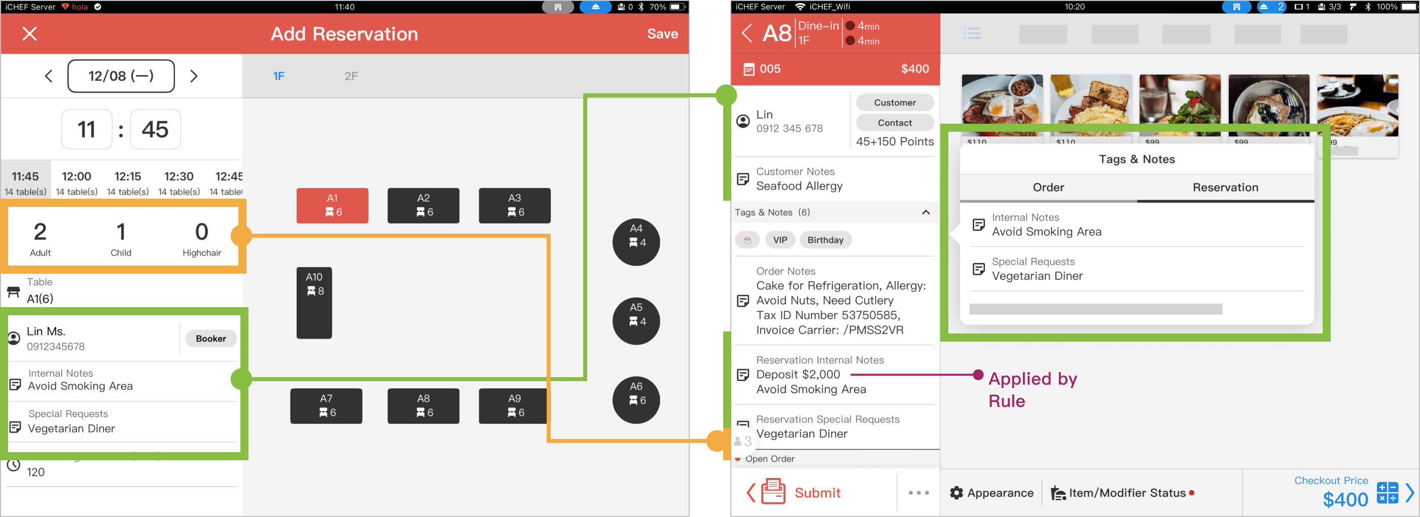 Through customer orders created via [Seat Guests], the following reservation information will be automatically imported, so staff do not need to manually input it.