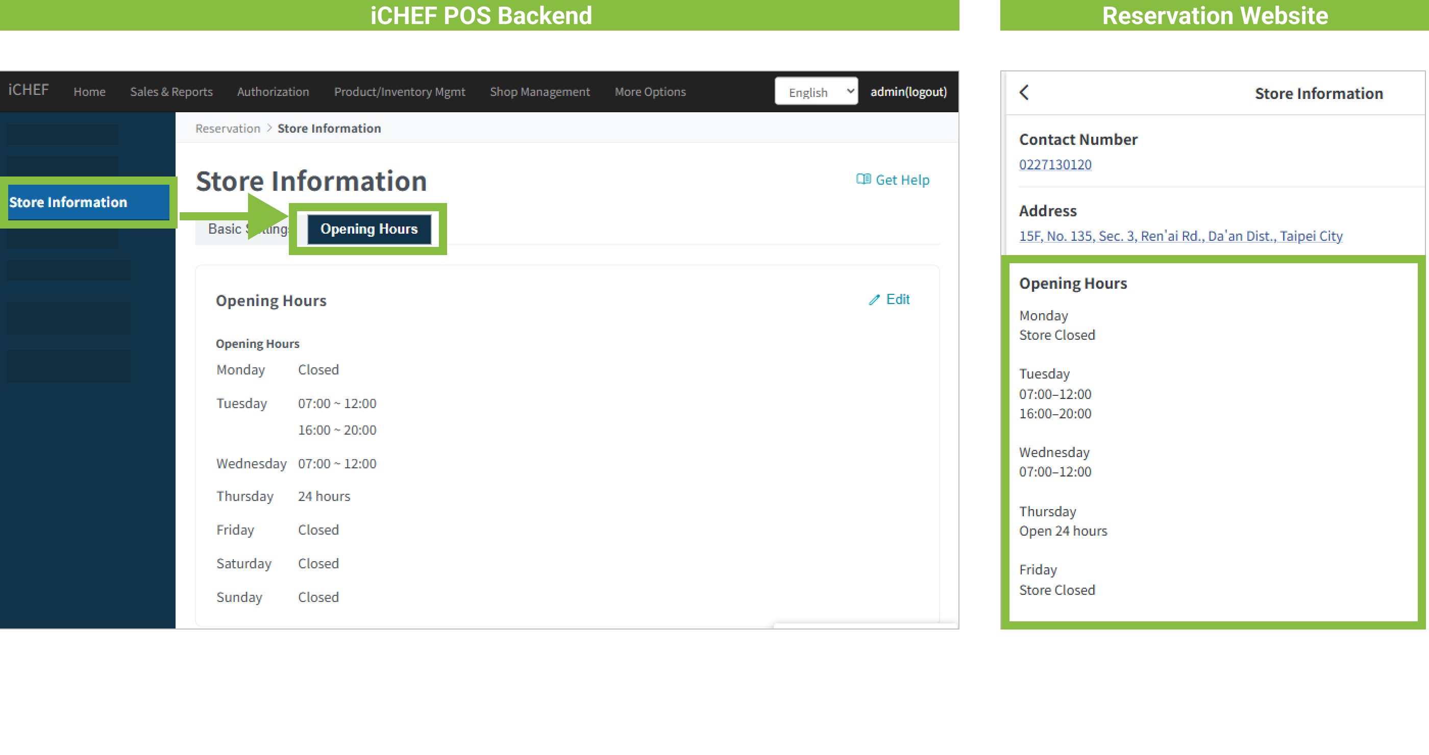➤ Backend Path: Online Store > Reservation > Store Information > Opening Hours