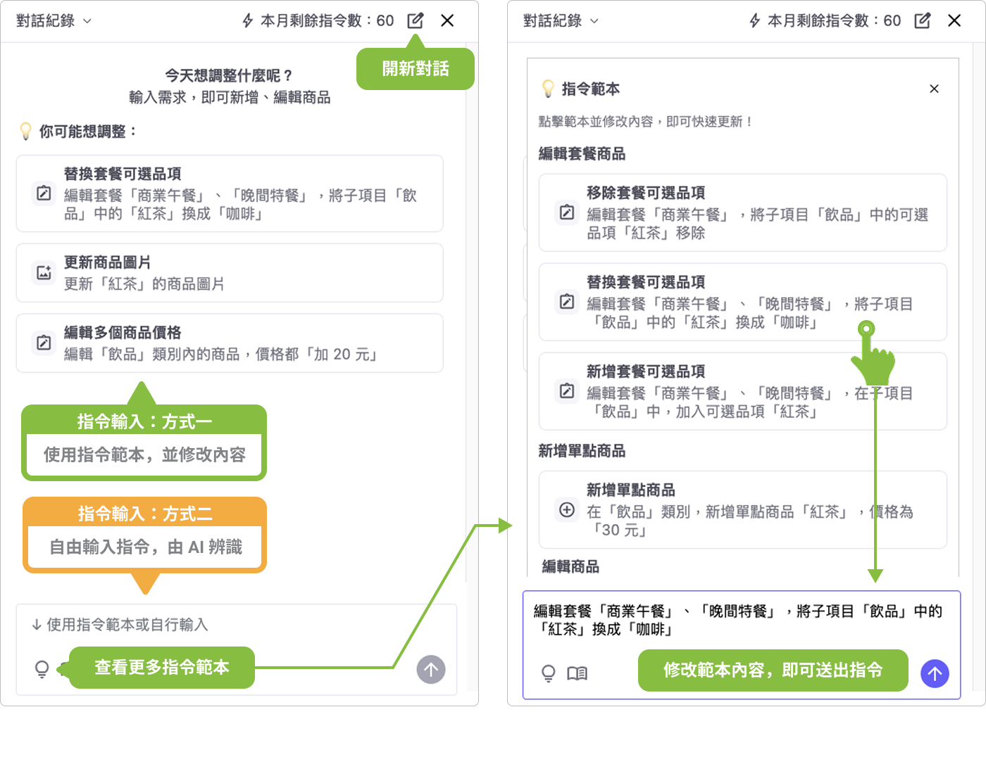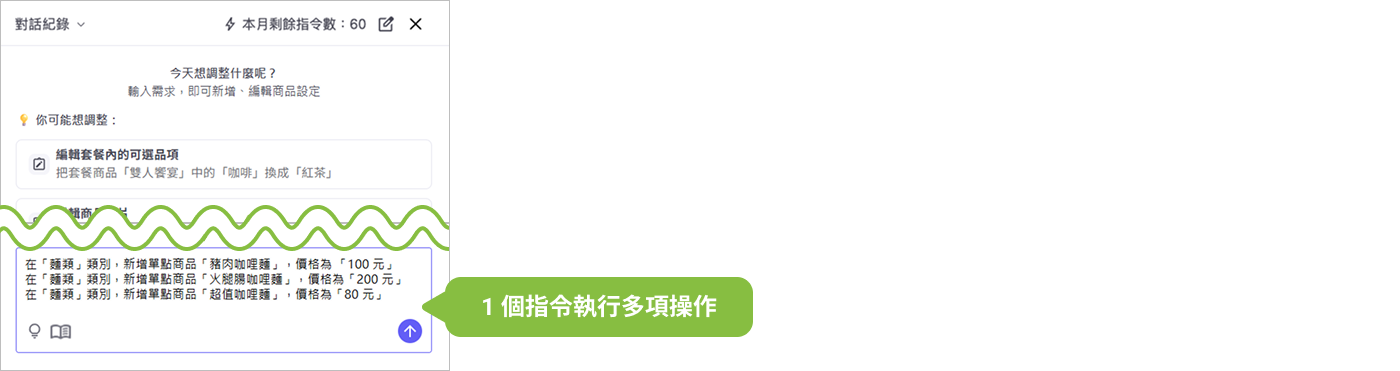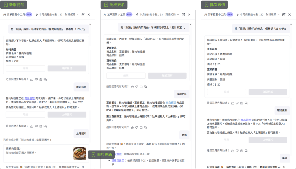 Whether adding items, batch renaming, changing prices, or uploading images, the AI Menu Update Assistant can help you get it done. Before making any changes to backend settings, the AI will confirm with you again, ensuring every operation is secure and accurate.