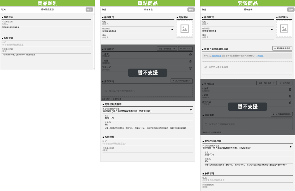 Supports most “Product Management” settings; only “Available Notes” and “Inventory Consumption” require manual adjustment.