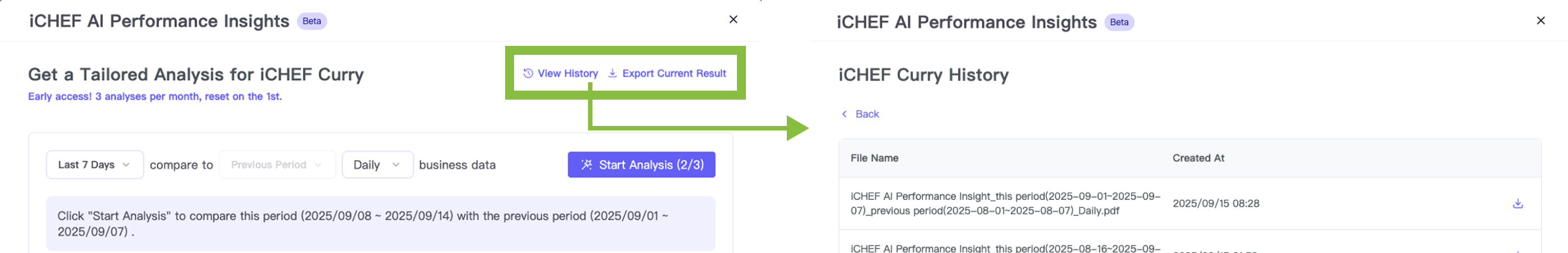 Each analysis is automatically saved as a PDF. Simply click “Export Current Results” to download. You can also conveniently find and download past records by file name in the “View History” section.