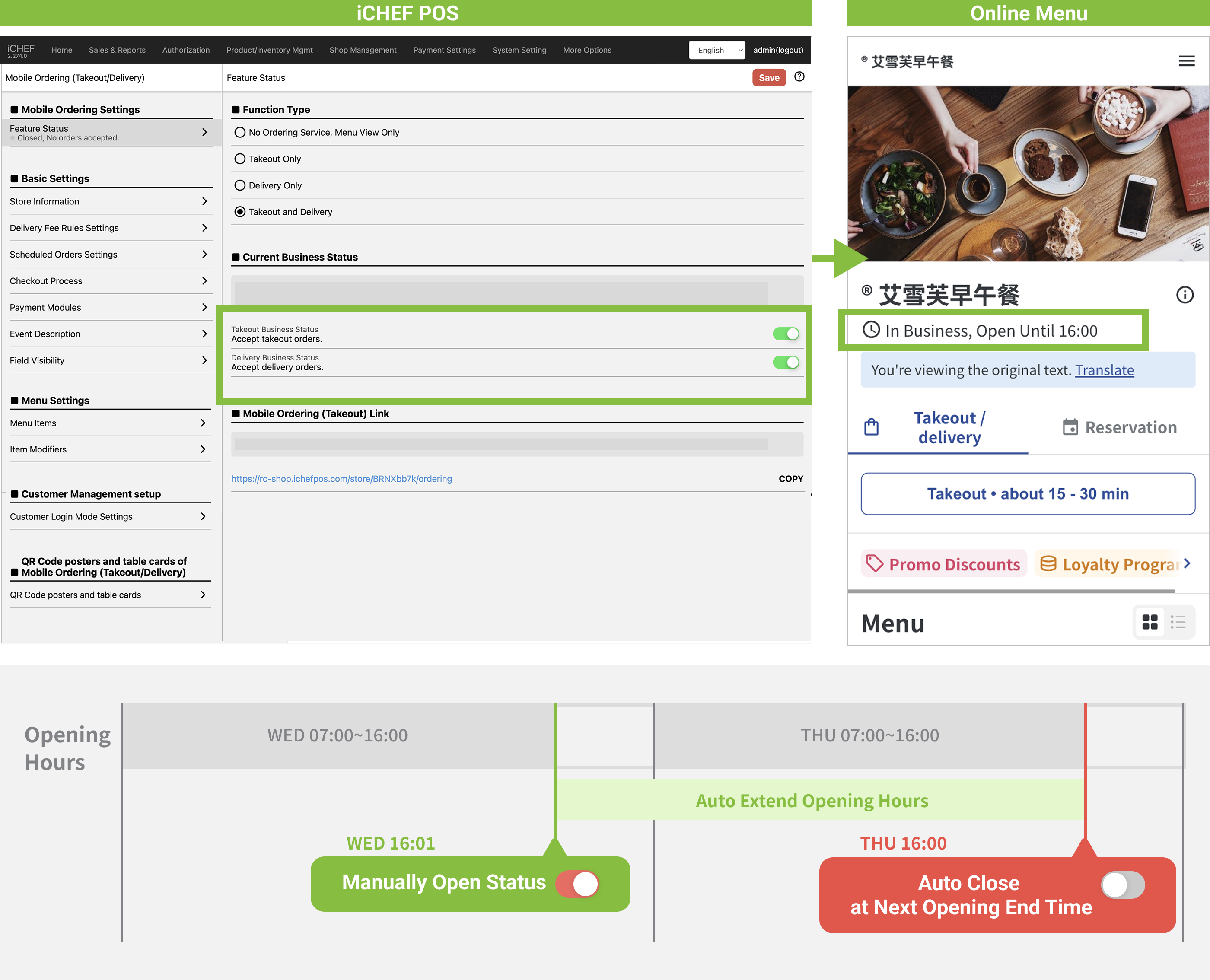 The Current Business Status for Takeout Ordering is automatically adjusted based on the settings in Store Information > Opening Hours.If you encounter situations where you are too busy and need to temporarily close online ordering, take a sudden break, or extend operating hours, you can manually adjust this instantly in the Backend or on the POS.