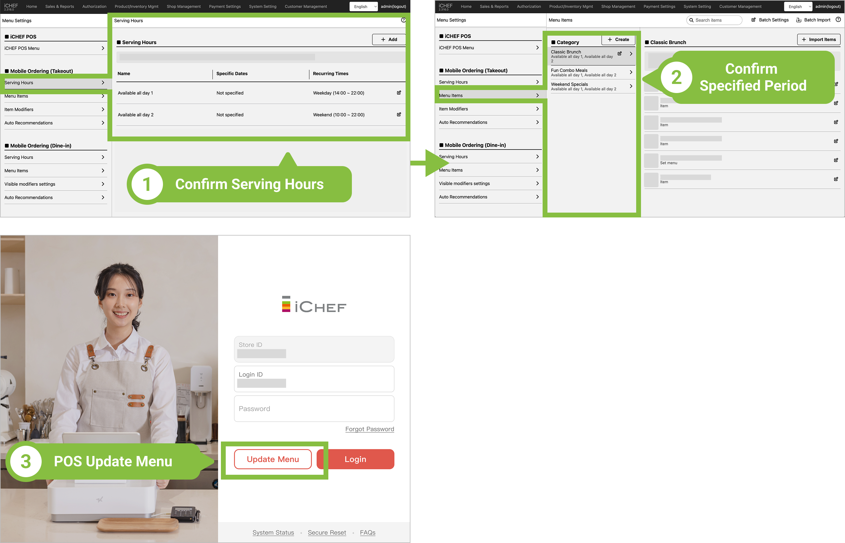 - ❸ After confirming the above settings, please Update Menu on iCHEF POS App for the changes to take effect.