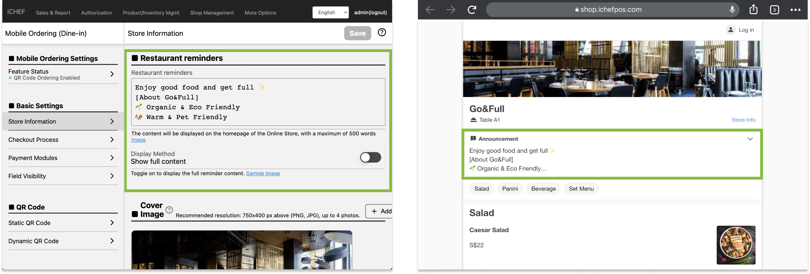You can fill in the [Restaurant reminders] in the [Online Store > Mobile Ordering (Dine-in)> Store Information] , the information will be displayed on the website , and the default display will be 3 rows. Consumers can expand the reminders manually, or you can open the “Show full content” to display the full content automatically.
