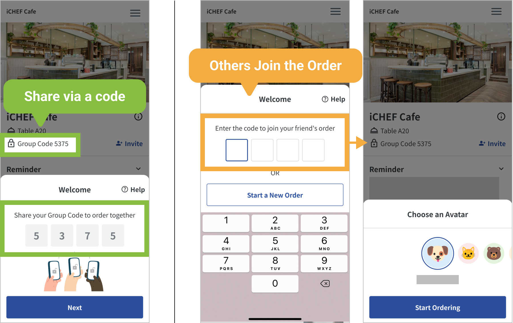 For group dining, customers can share the order with their companions via a code or link.