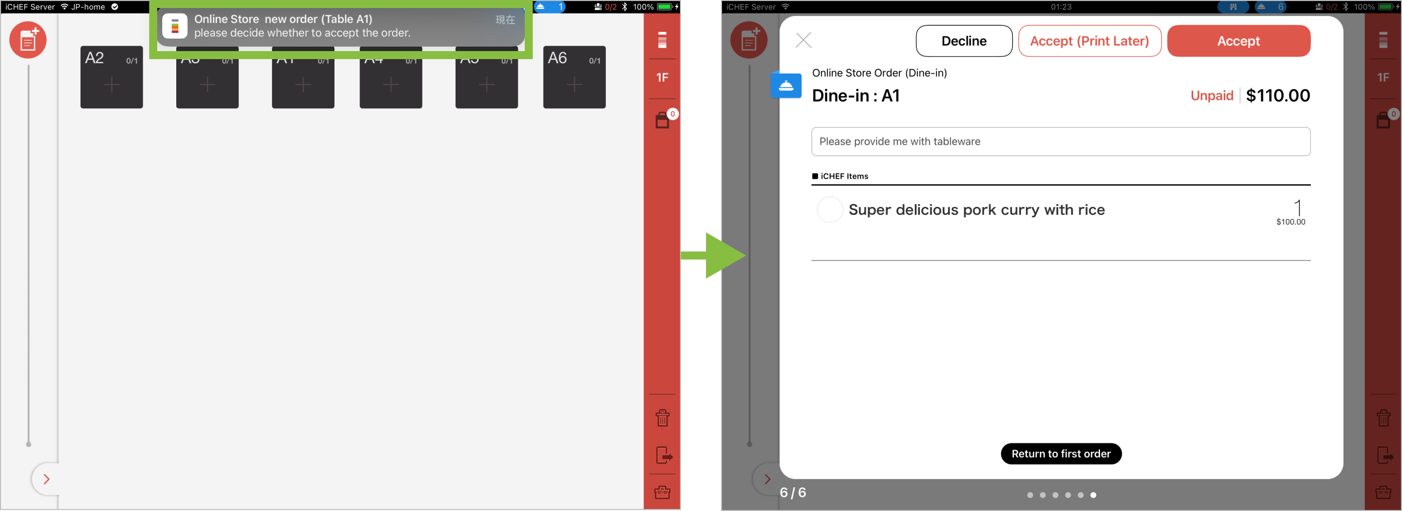 When customers place an online order through the [Online Store], iCHEF POS will notify you in two ways. Tapping the notification or icon will take you to the order acceptance window.
