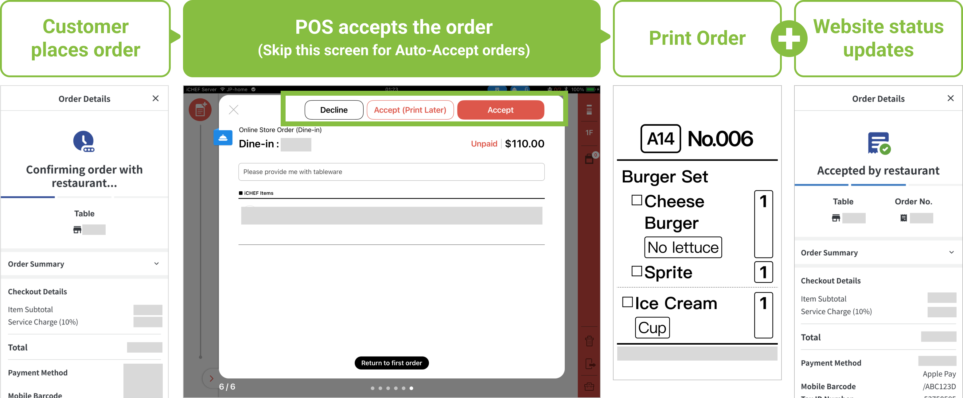 Configure [Auto-Accept] and the [Accept (Print Later)] option on the acceptance screen via the iCHEF POS App and the Backend. Settings will sync automatically:
