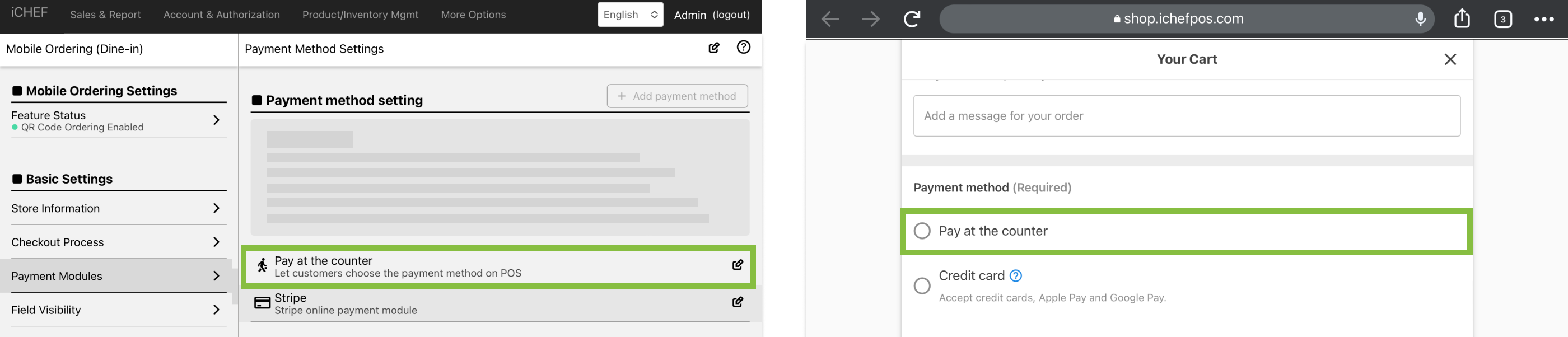Please go to the cloud restaurant > to use the QR code to order > the payment module to set up a new payment method for on-site payment, after the consumer selects this payment method, the store staff can use the payment module on the iCHEF POS to assist the user to complete the checkout.