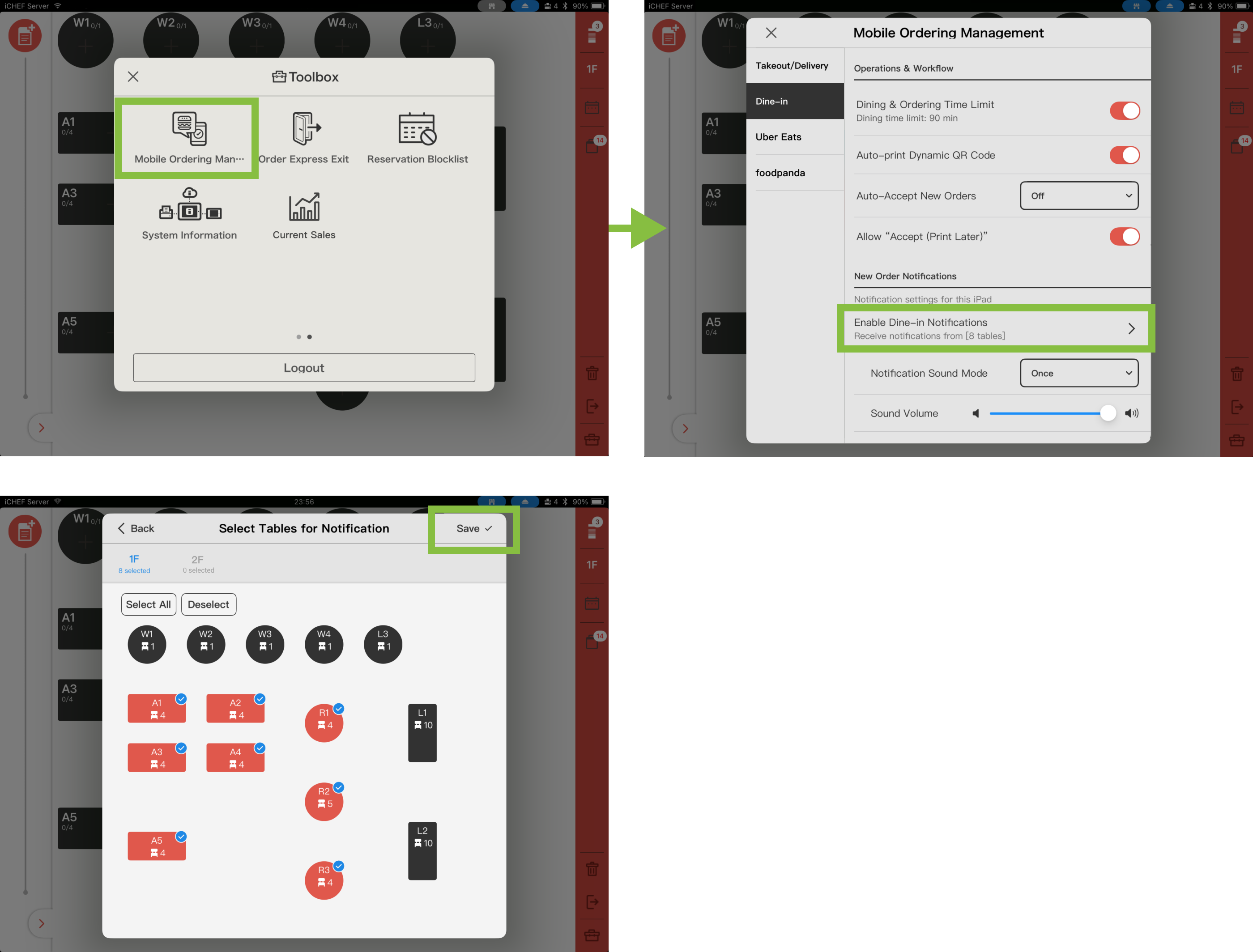 - Please confirm that the [New Order Notifications] in iCHEF POS App > [Toolbox] > [Mobile Ordering Management] are turned on.