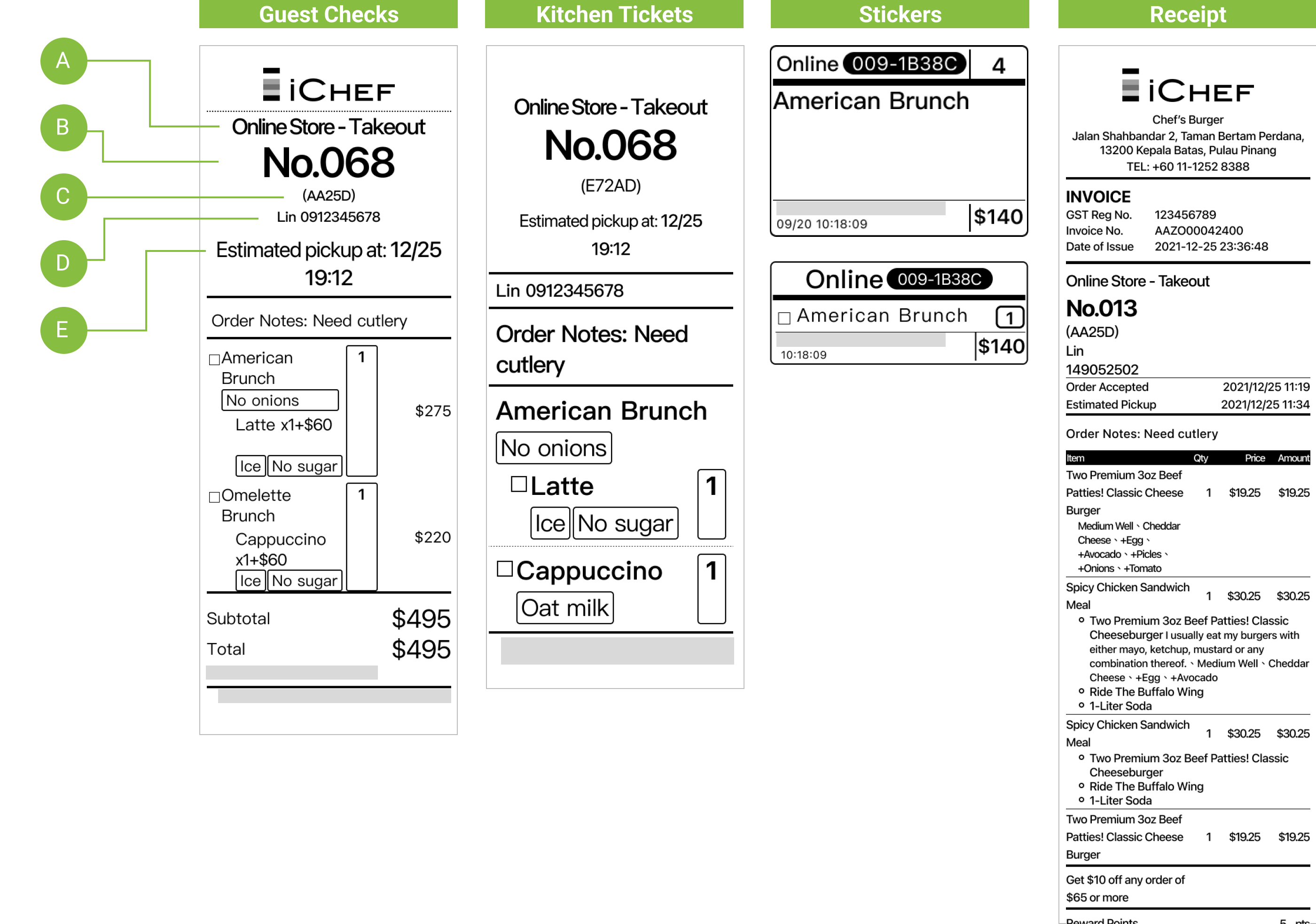 - B: Order Serial Number (numbered by POS acceptance sequence, e.g., 001-100)