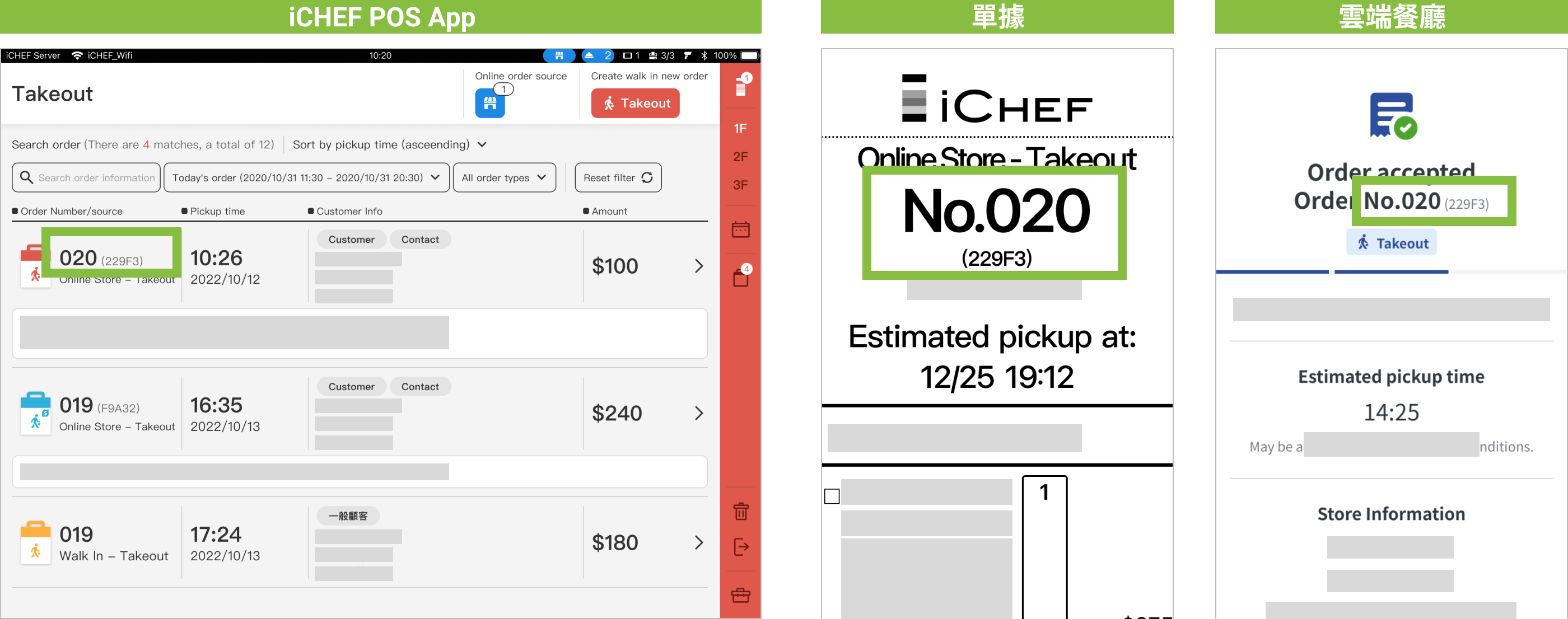 In-store, you can view this on the [Takeout List] in the iCHEF POS App and on the printed [Receipt (Transaction Receipt, Guest Checks, Kitchen Tickets, Stickers)]; customers can view it on the order status page of the [Online Store].
