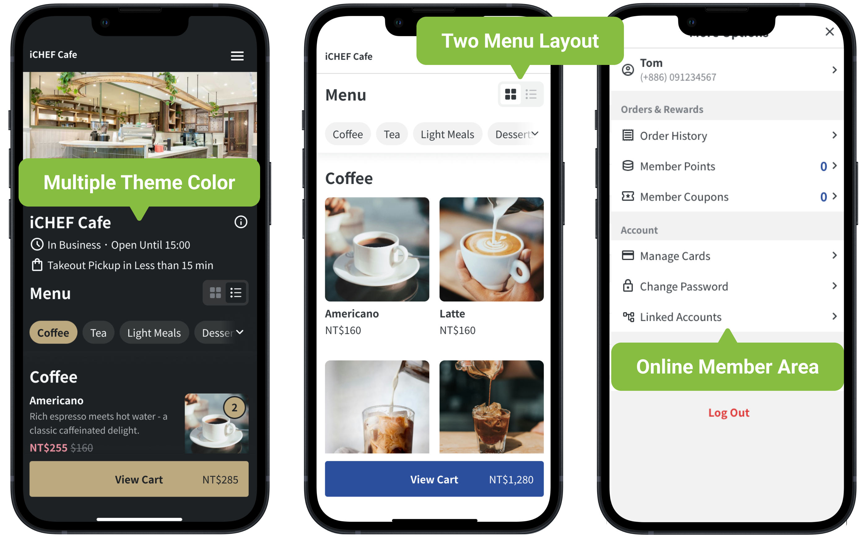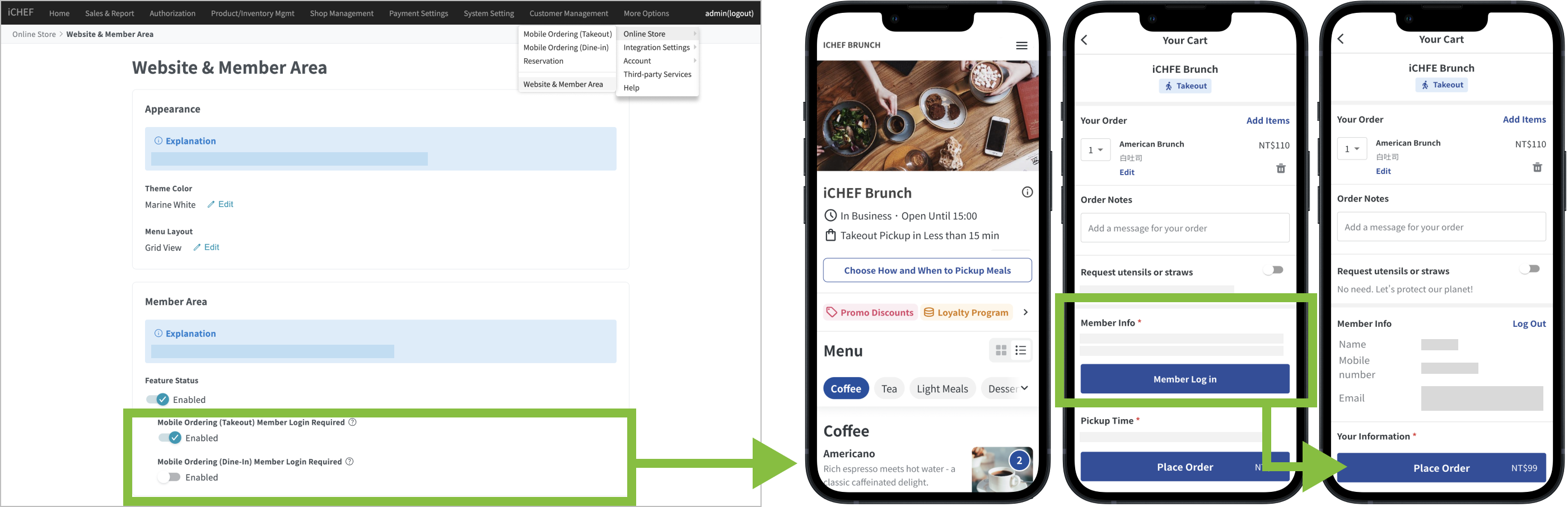 After you enable the feature status of [Member Area] for you online store, the system will update the websites of Mobile Ordering (Takeout) and Mobile Ordering (Dine-in) in real time. Customers can register online or log in as a member, and have their members’ information, visits, coupons and points history updated.