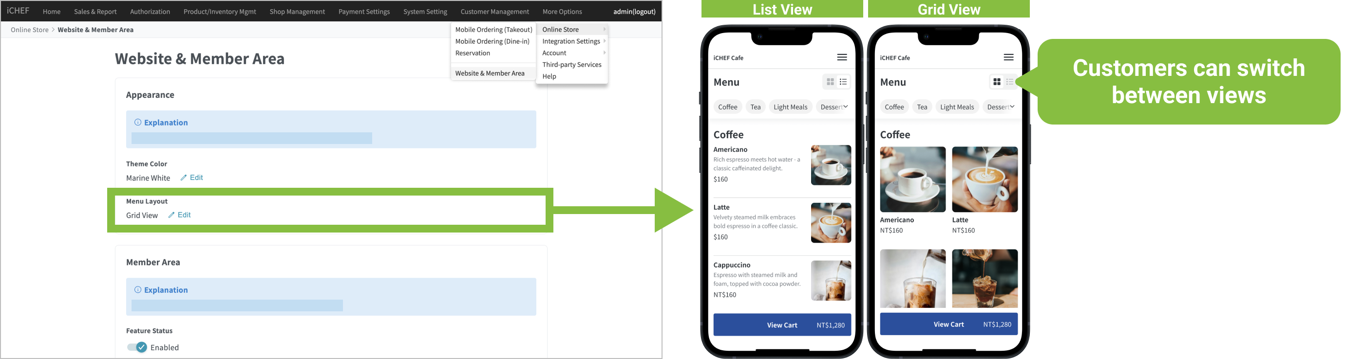 There are 2 views, grid view and list view, for you to choose from. This setting will be synced with that on the websites of Mobile Ordering (Takeout) and Mobile Ordering (Dine-in). Despite the setting, customers can switch between the views as they like.