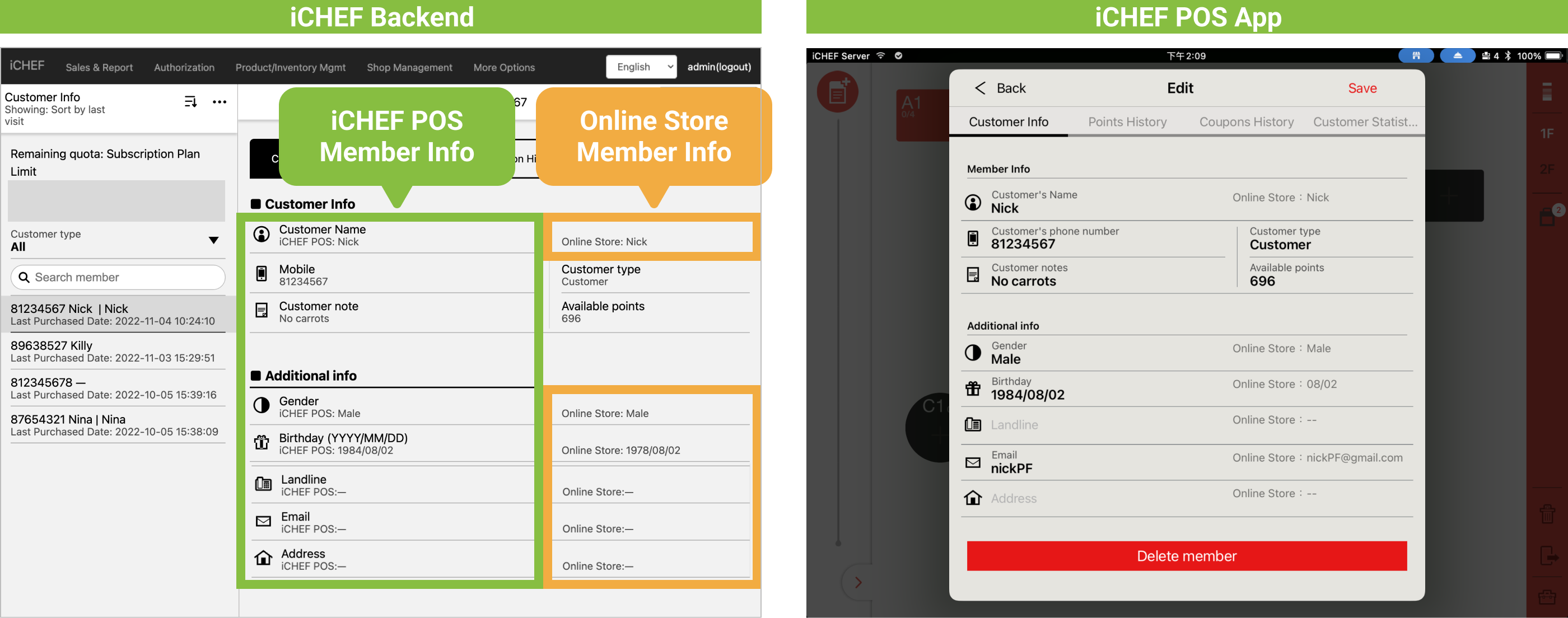 All of the members’ information will be integrated in iCHEF, no matter it is from your iCHEF POS App or mobile ordering platforms. For the customer who has already registered as a member, the system will match the information by his/her mobile phone number, and you can check the full info from the backend or the POS.