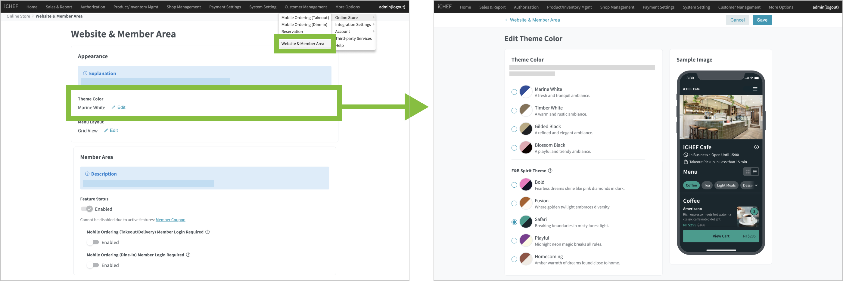 In the backend, you can select a theme color and menu layout that suit your online store better, and enable the functions for member area to manage the membership of online and on-site customers more efficiently! Through these settings, you are on your way to enjoying a prospering business with multi-channel marketing.