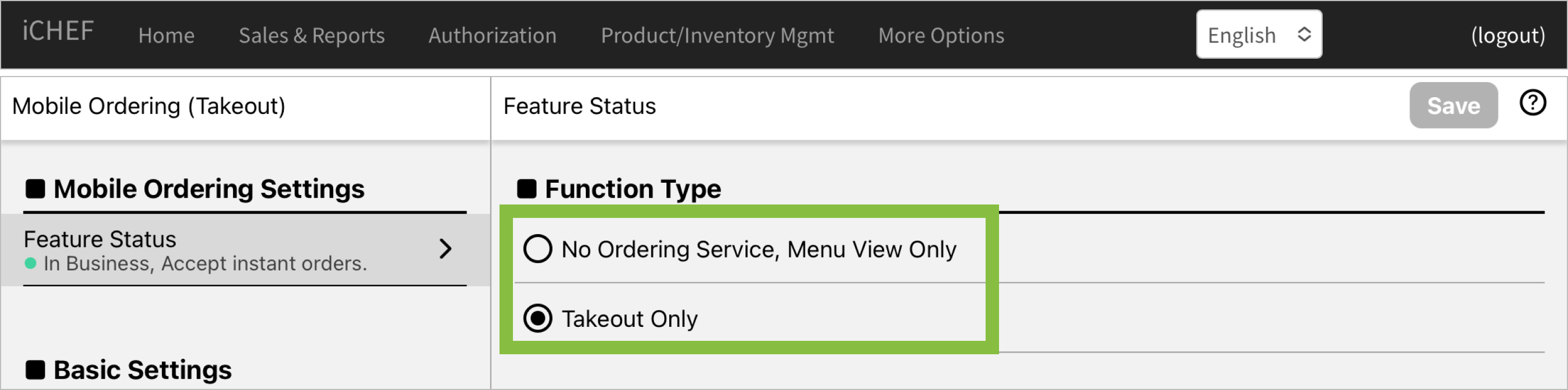 Go to iCHEF POS App > [Toolbox > Mobile Ordering Management > Operations & Workflow] to instantly close your takeout operating status. You can then re-enable the feature from the same location(this setting will synchronize with the backend at [Online Store > Mobile Ordering (Takeout)> Feature Status]).