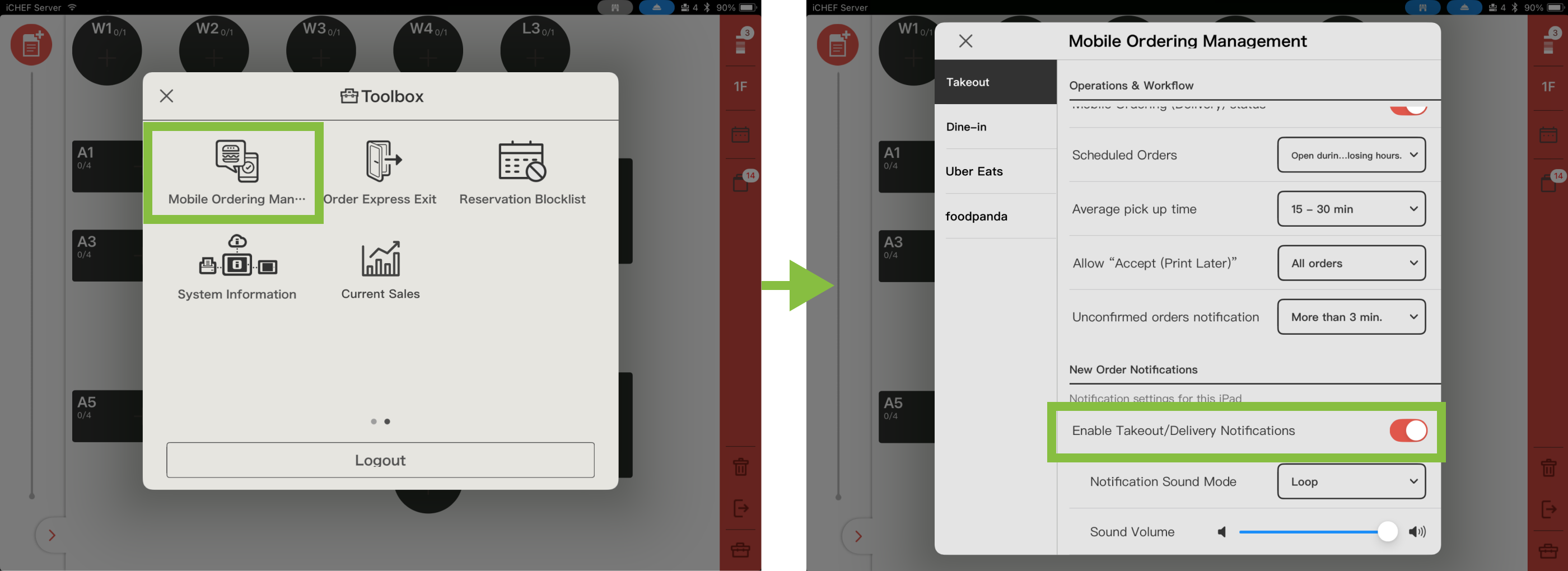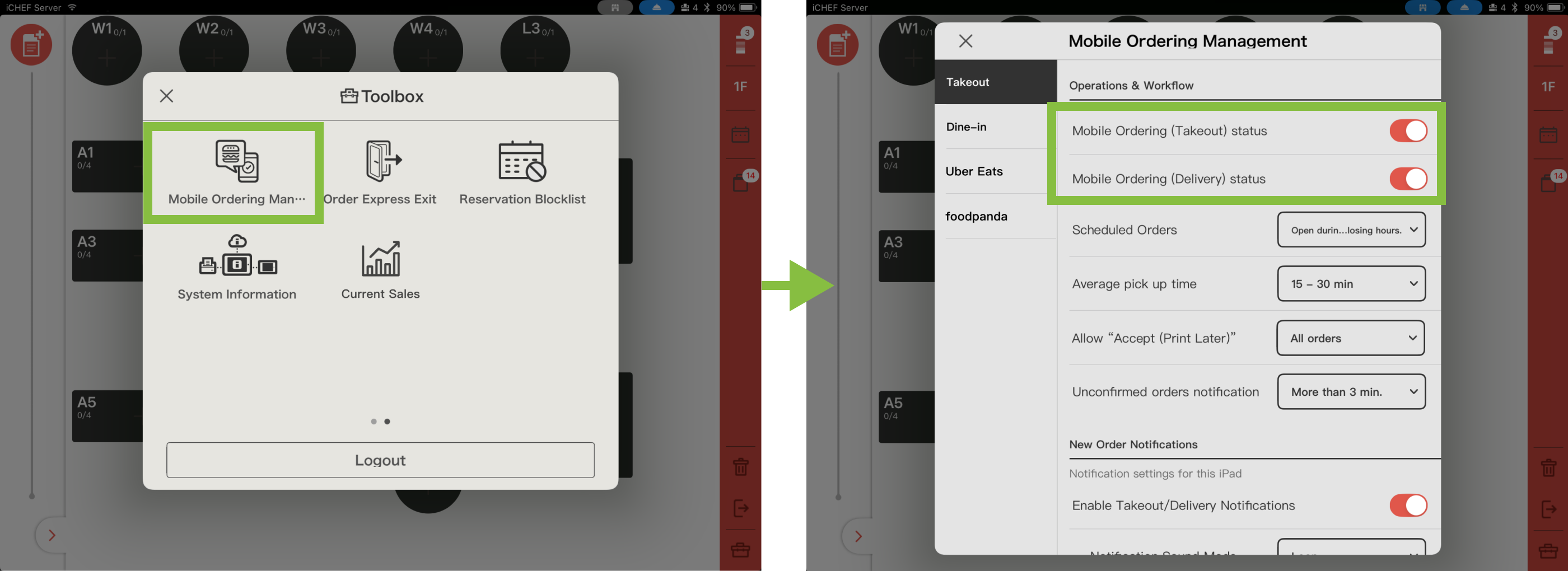 - Please confirm that the [New Order Notifications] in iCHEF POS App > [Toolbox] > [Mobile Ordering Management] are turned on.