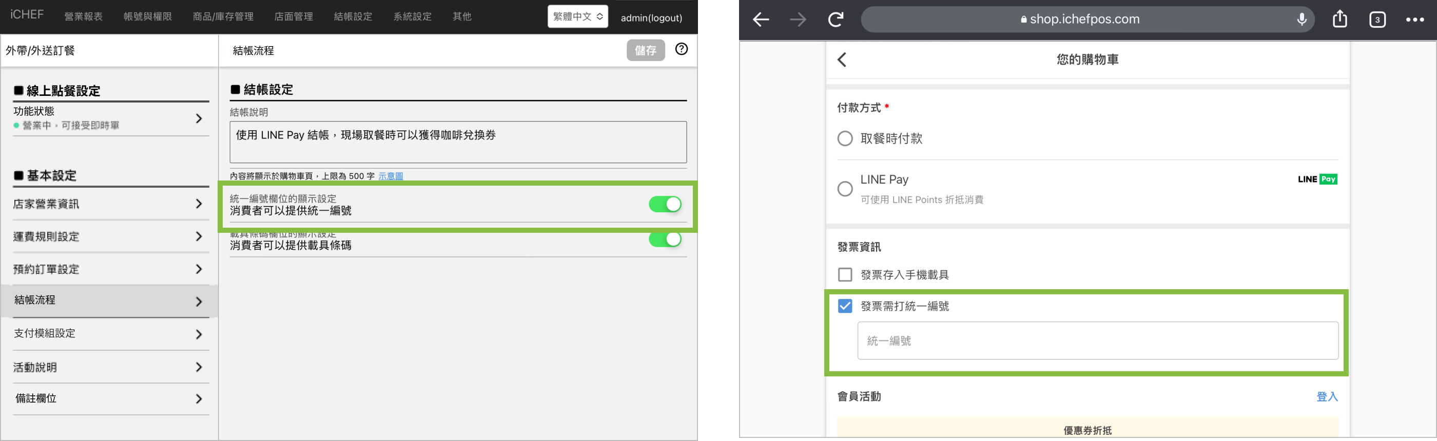 若有使用 iCHEF POS 開立台灣電子發票時,請將統一編號欄位的顯示設定調整為開啟,讓消費者在送出訂單前直接輸入統一編號,當訂單結帳時會自動印出帶有統編的電子發票。