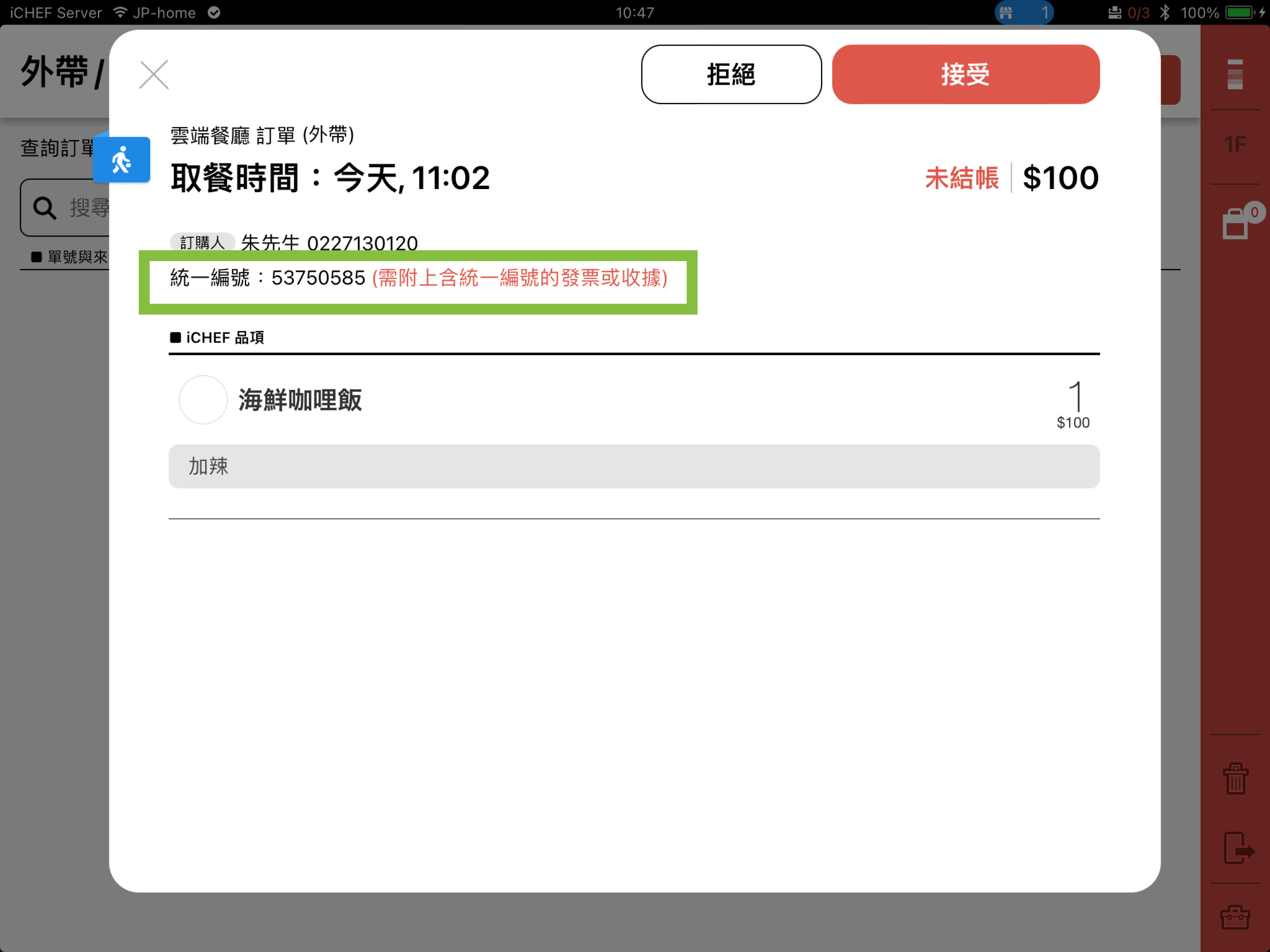 若沒有透過 iCHEF POS 開立台灣電子發票,但有開啟統一編號欄位的顯示設定時,消費者仍然可以在購物車中輸入統一編號。在接單視窗與查看訂單內容時,可以看到消費者所輸入的統一編號資訊,請額外提供收據或手開發票給消費者。