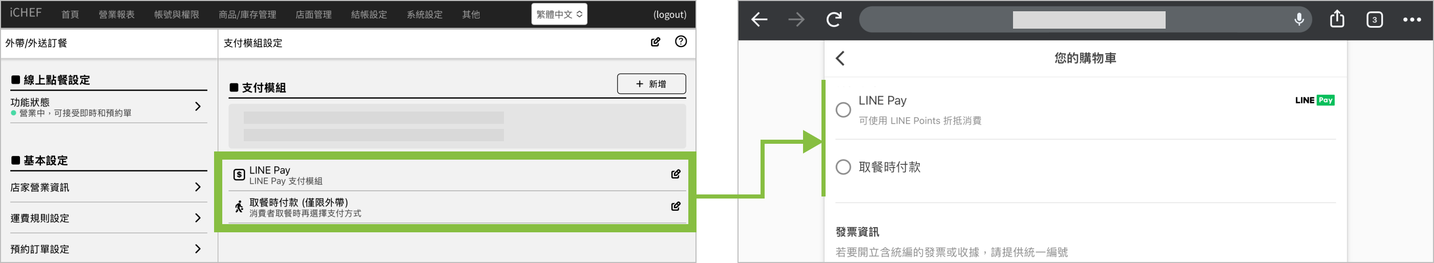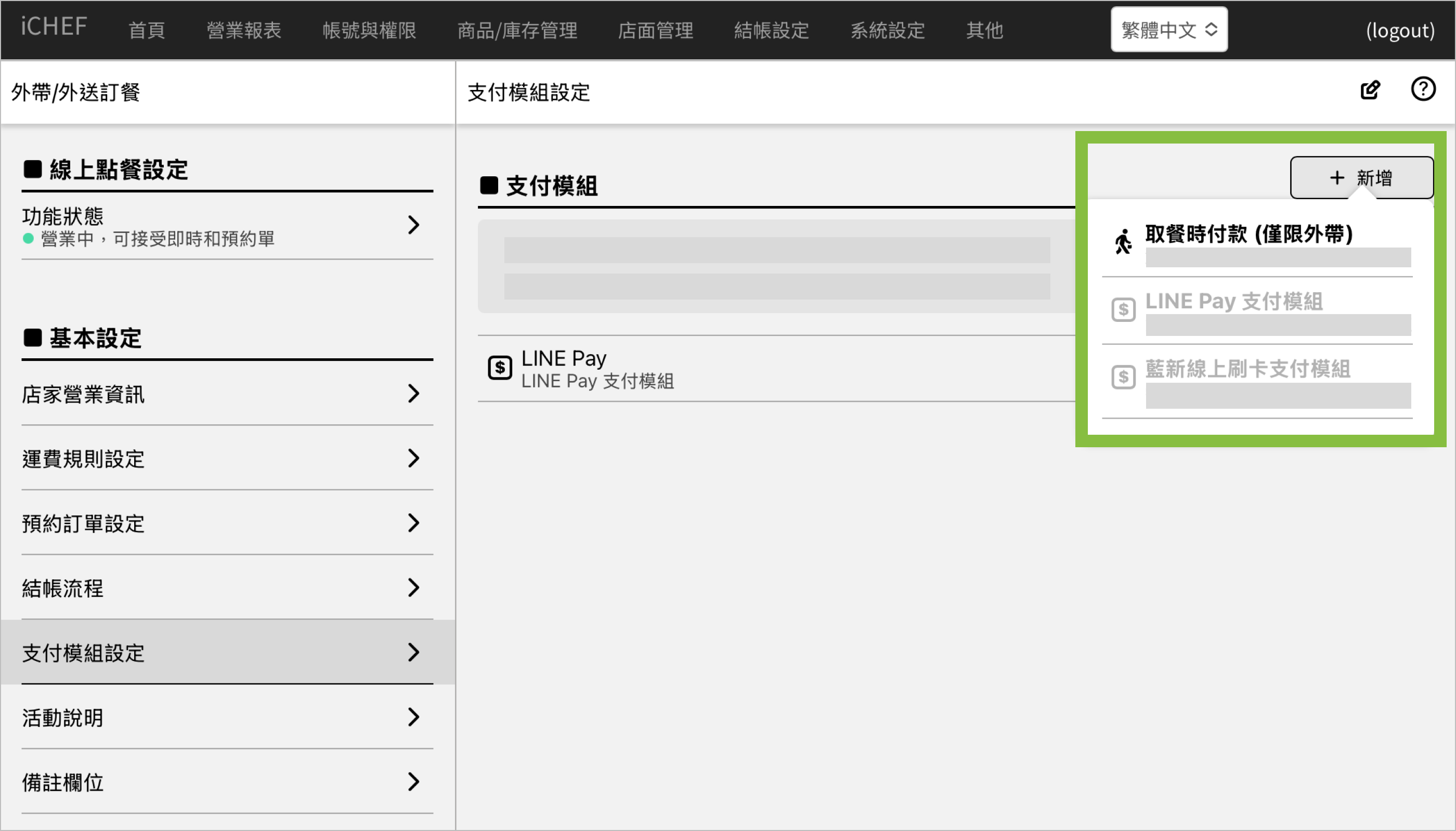 ➤ 後台位置:雲端餐廳 > 外帶訂餐 > 支付模組設定