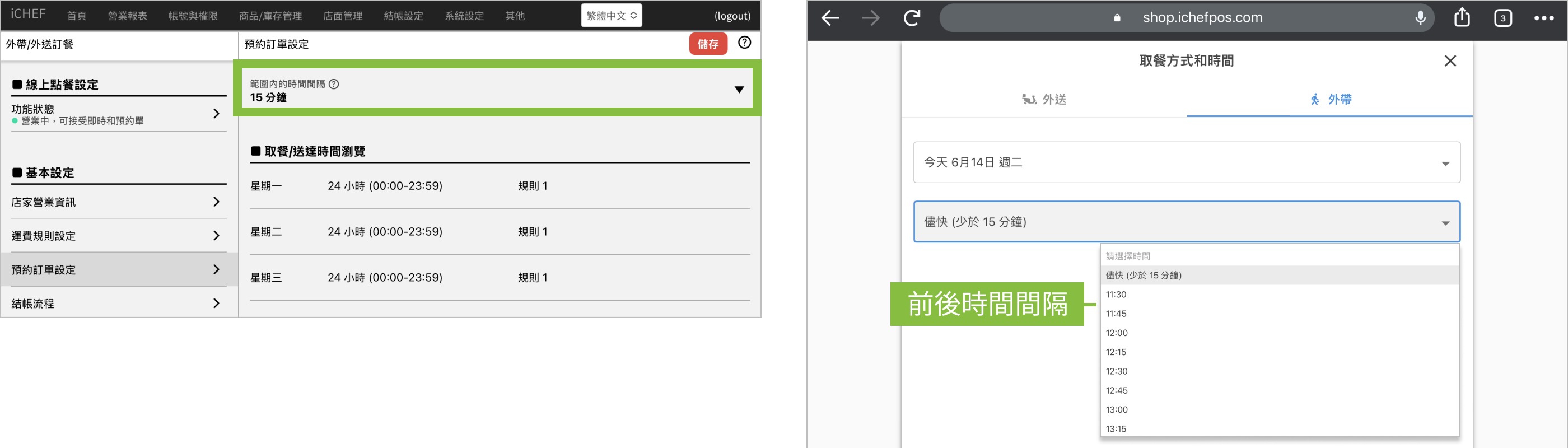 可以調整取餐時間範圍中,前後時間的間隔分鐘數。