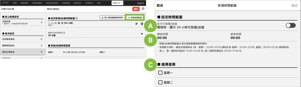 若時間有跨日的需求,需設定 2 段的取餐時間範圍使系統自動判斷並完成合併,下面透過示範來說明。