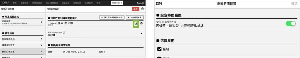 除了透過匯入雲端餐廳的營業時間外,店家也可以自行設定取餐時間範圍。