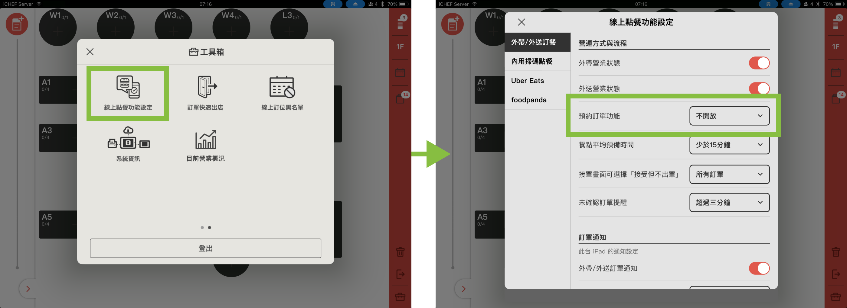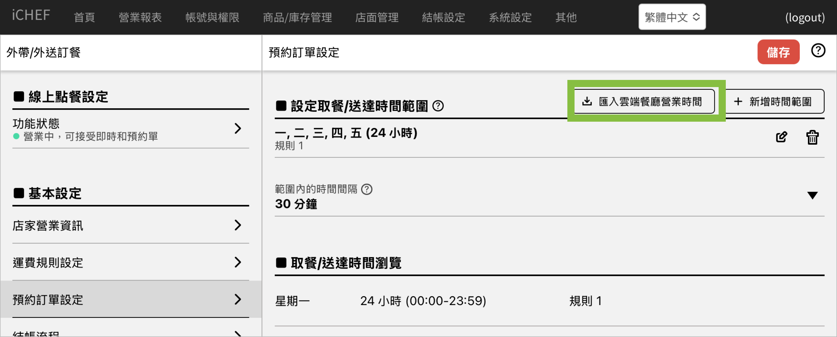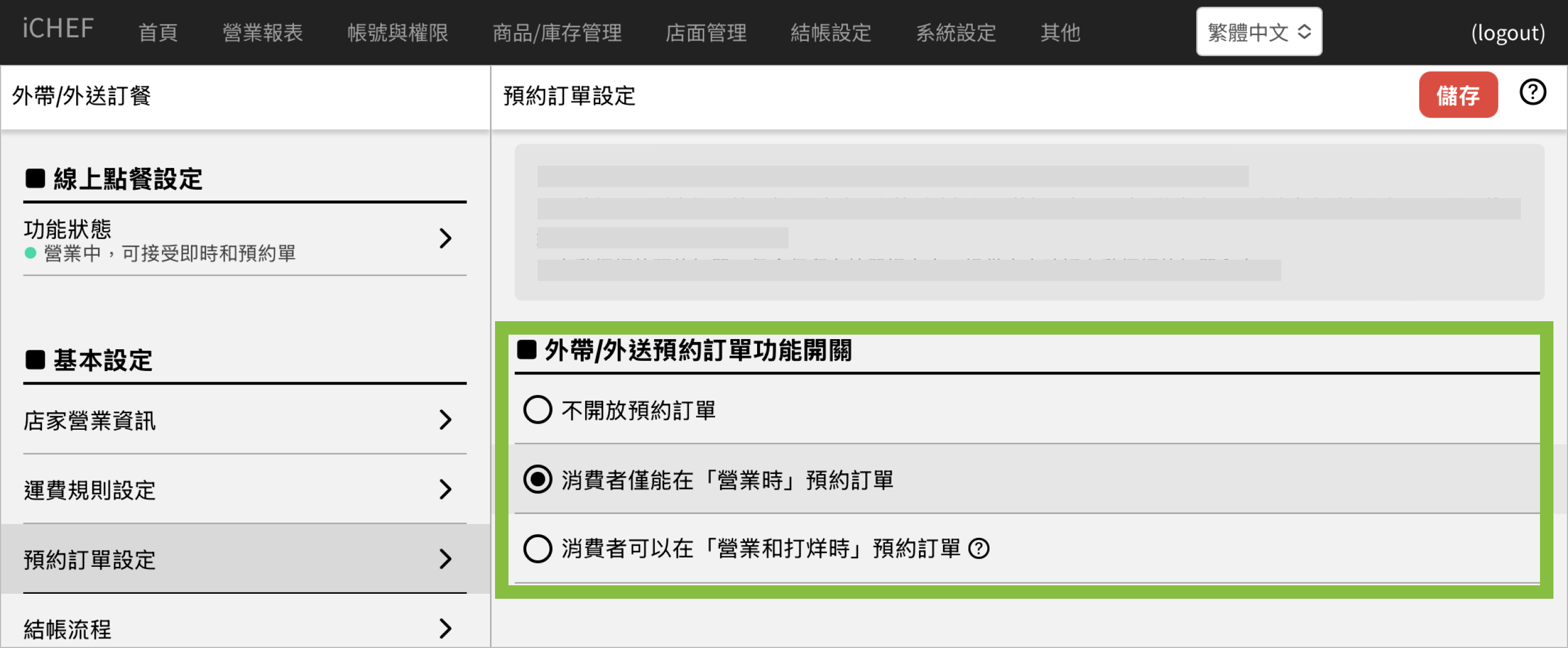 1. 請至 雲端餐廳 > 外帶/外送訂餐 > 預約訂單設定