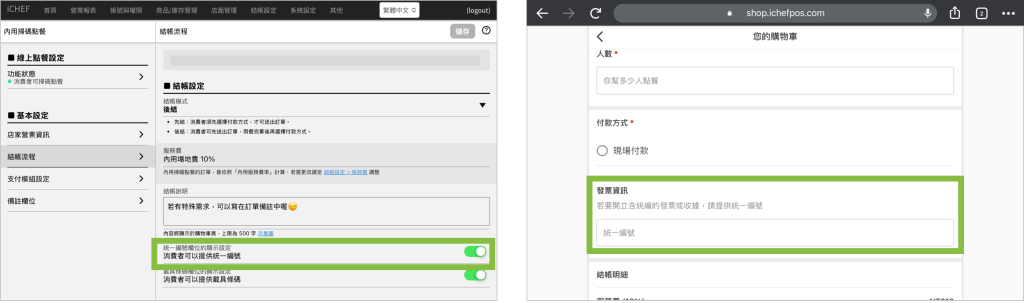 若有使用 iCHEF POS 開立台灣電子發票時,請將統一編號欄位的顯示設定調整為開啟,讓消費者在送出訂單前直接輸入統一編號,當訂單結帳時會自動印出帶有統編的電子發票。