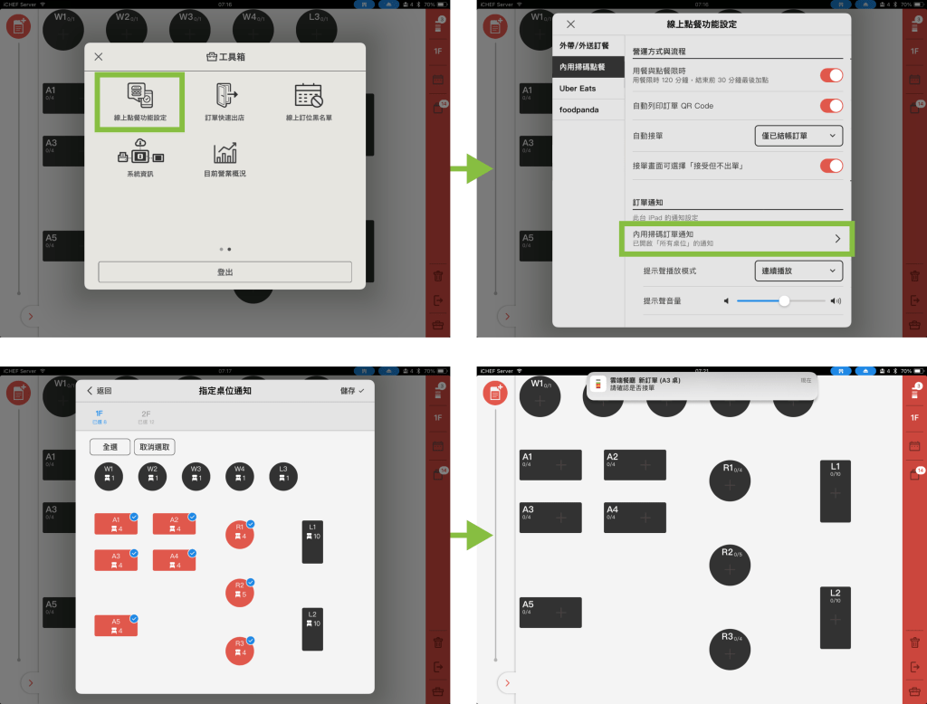 - 指定 iPad 推播通知:在每台 iPad 的 「工具箱 > 線上點餐功能設定」可指定桌位通知與設定提示聲,當收到訂單時就會在上方跳出推播通知。