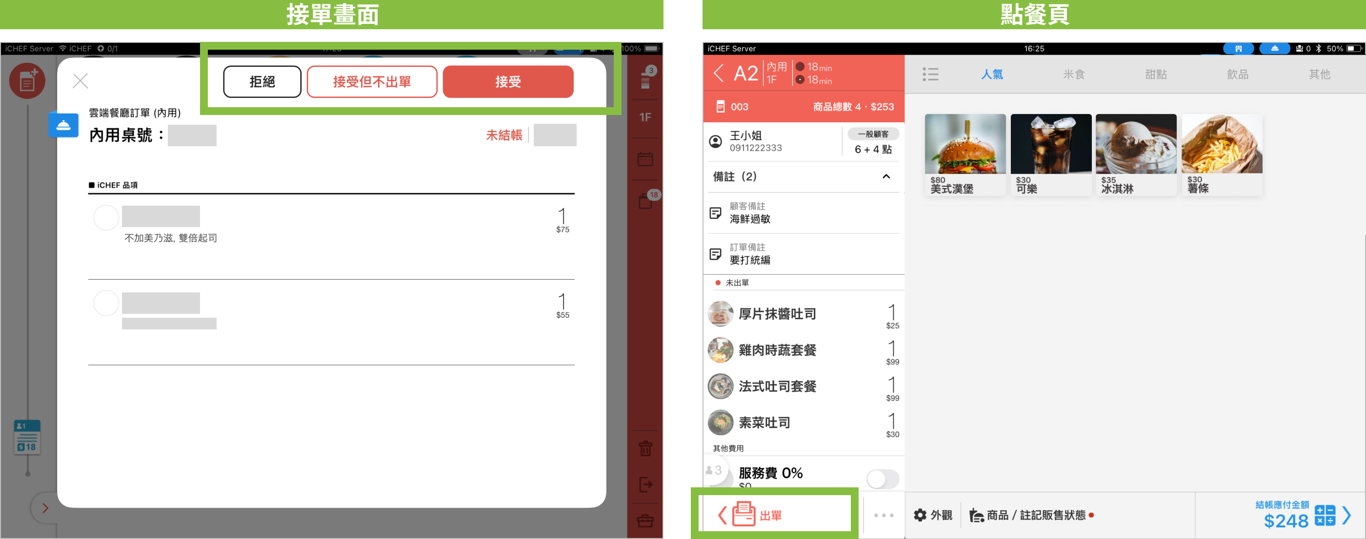 若選擇「接受但不出單」可在後續確認要開始做餐時,再透過點餐頁出單至廚房。