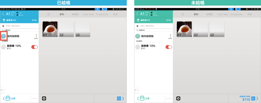 當客人已用餐完畢並完成結帳時,即可將訂單拖曳出店,釋放 iPad 效能。