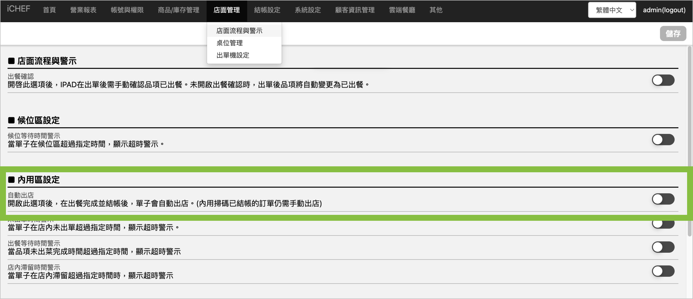 若你的店內設定為「後結模式」用餐完畢後再結帳,也可以在後台 店面管理 > 店面流程與警示 將內用區設定中的「自動出店」開啟,當訂單完成結帳時系統就會自動幫你出店,提升營運效率!