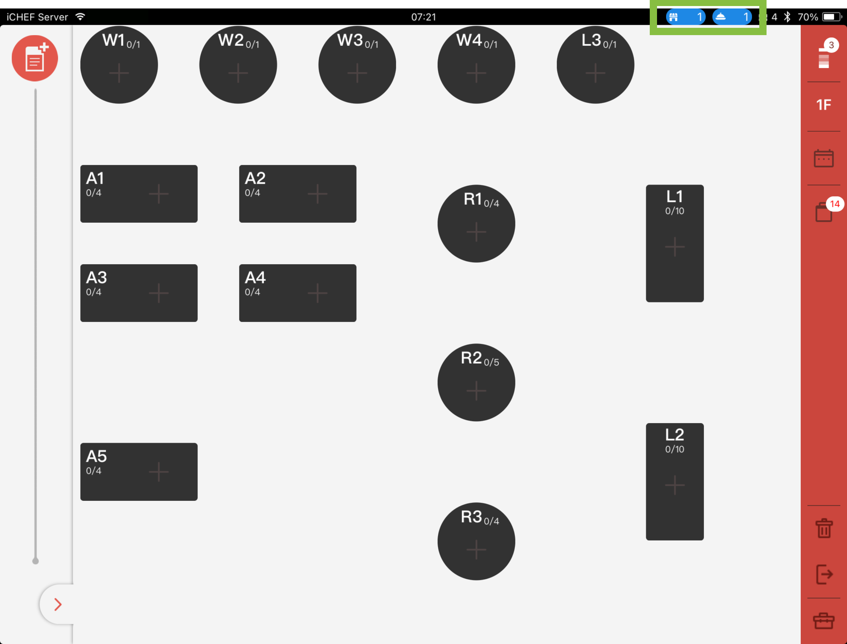 - 固定狀態列查看:不論是否有打開訂單通知,店內所有 iPad 皆可由 iCHEF POS App 最上方的系統狀態列查看目前的接單狀況和待處理訂單數量。
