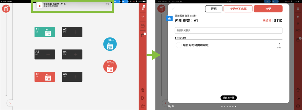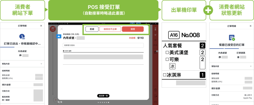 消費者在網站送出訂單後,iCHEF POS App 會透過推播通知和音效提醒有新訂單,店員即可在 iPad 上接受訂單,並依照店內流程出單,操作流程無縫接軌!