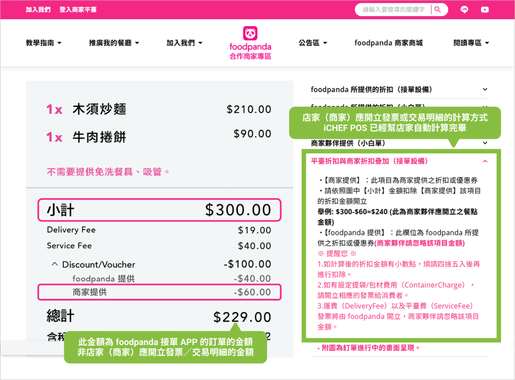 依 「foodpanda 官方說明」店家所開立的發票/交易明細,僅需計算餐點金額與 Vendor(店家負擔)的折扣即可;其餘金額將由 foodpanda 另行開立給消費者。