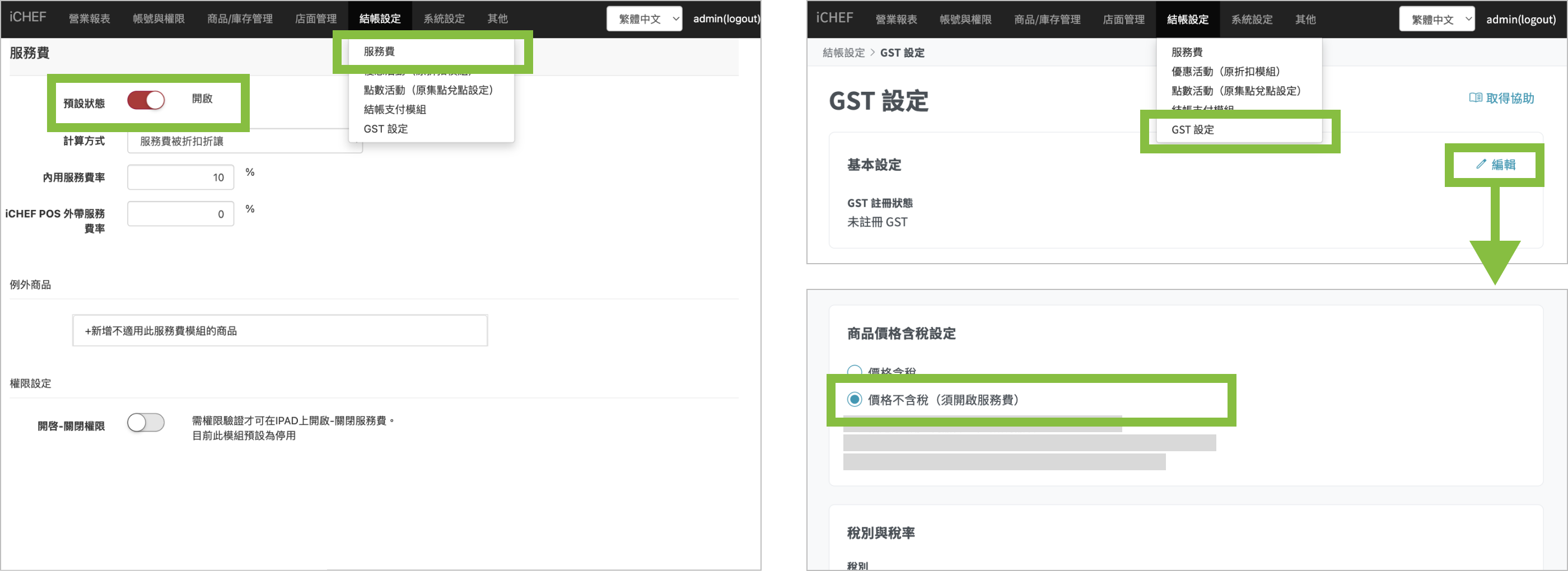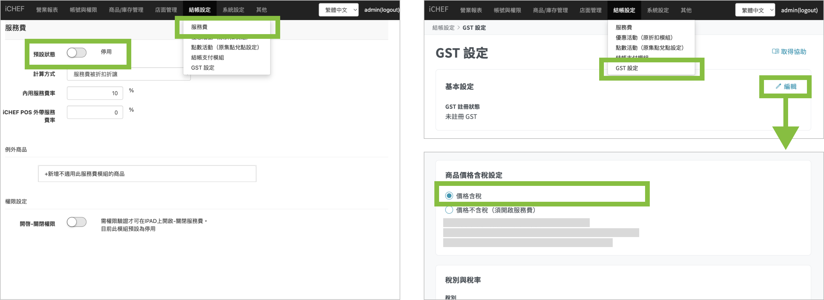 當 結帳設定 > 服務費 預設狀態為「開啟」時,才能調整價格含稅設定。