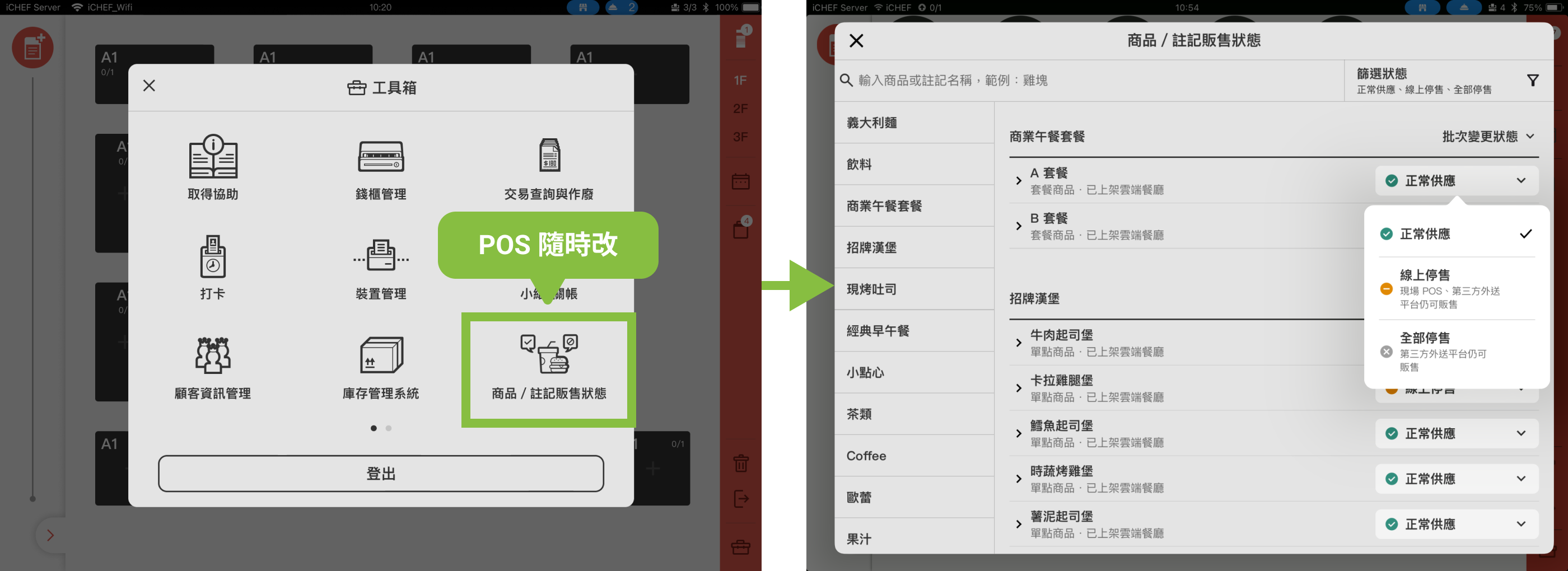 在 iCHEF POS App 中可透過工具箱或點餐頁前往「商品/註記販售狀態」頁面。找到商品即可編輯狀態,所有操作會自動儲存,即時更新。