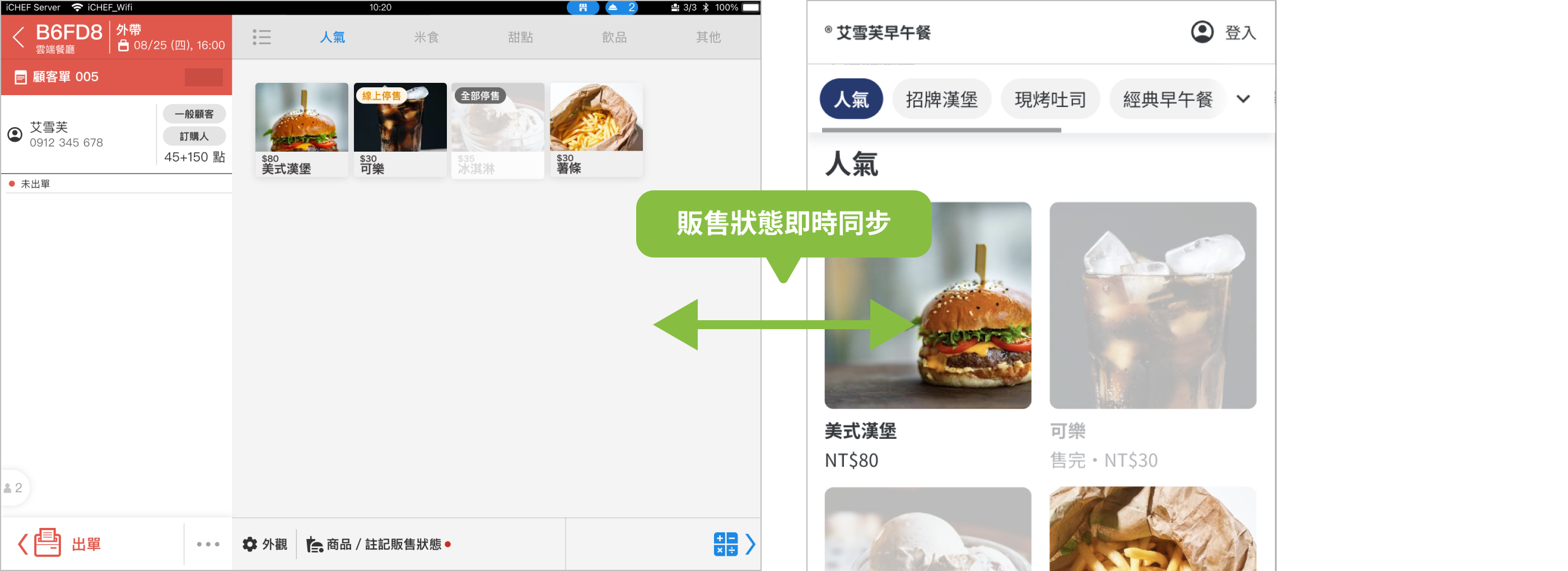 變更狀態後,停售的商品將會在 POS 點餐頁、雲端餐廳線上點餐菜單標示如下: