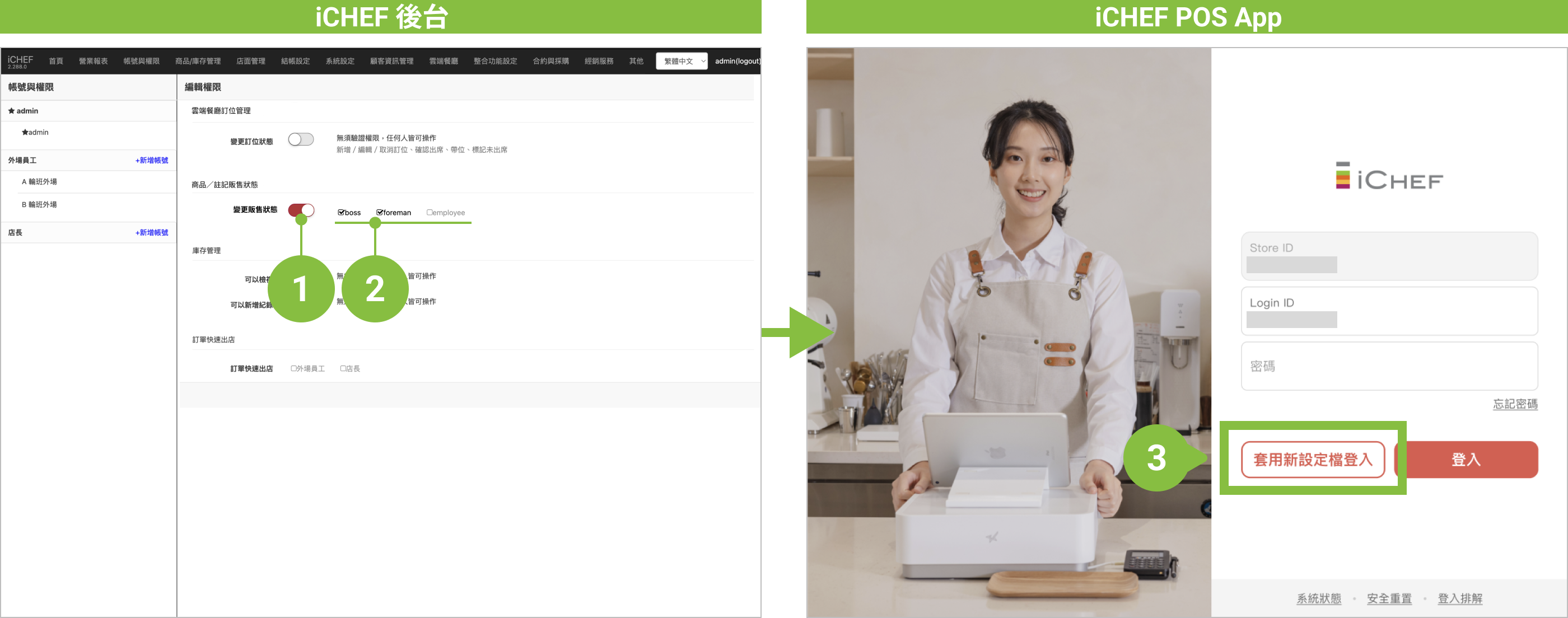 - 步驟 3:在 iCHEF POS App 套用新設定檔,即可開始限制操作權限。
