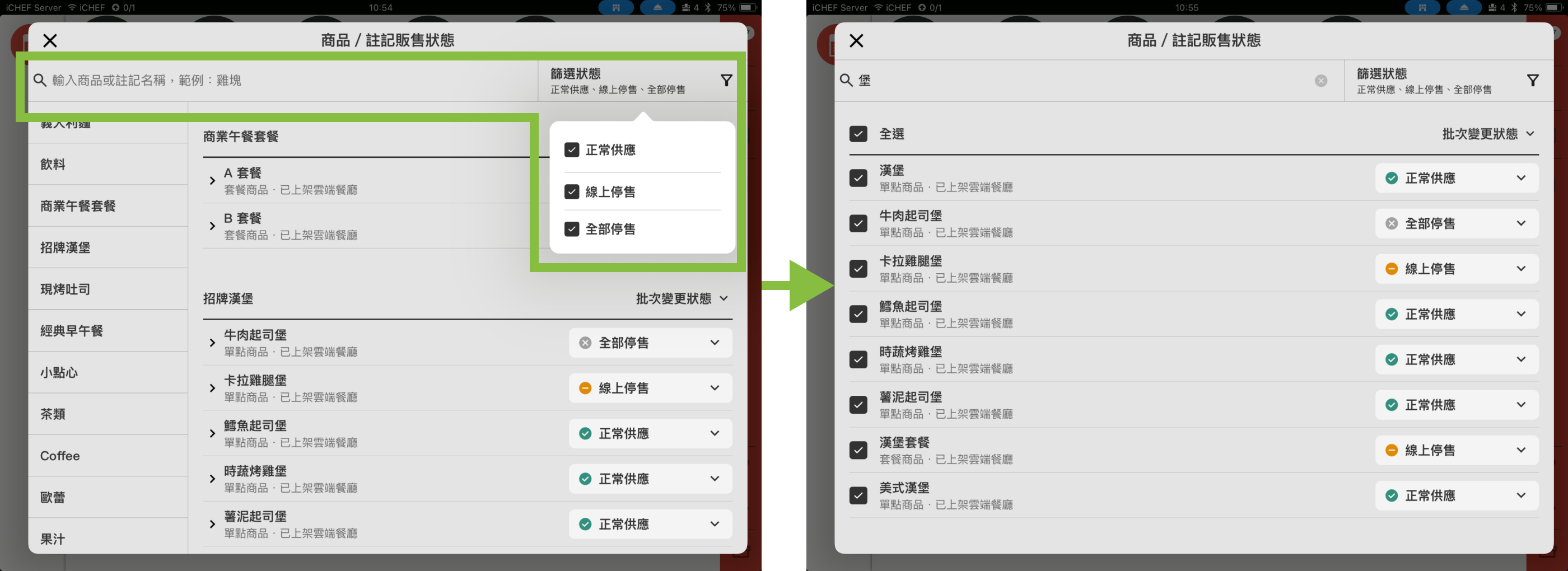 可以直接從類別中檢視或搜尋商品/註記名稱,找到你要調整的品項。還能透過篩選器,一次看到當前相同狀態的所有品項。